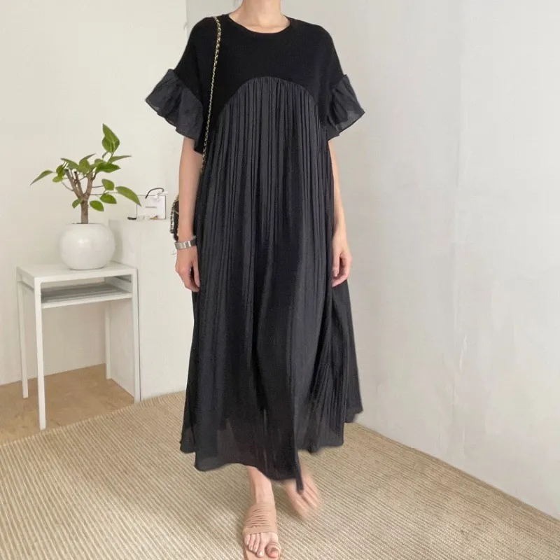 衣都精品- 新款法式輕熟風圓領拼接荷葉邊飛飛袖褶皺連衣裙