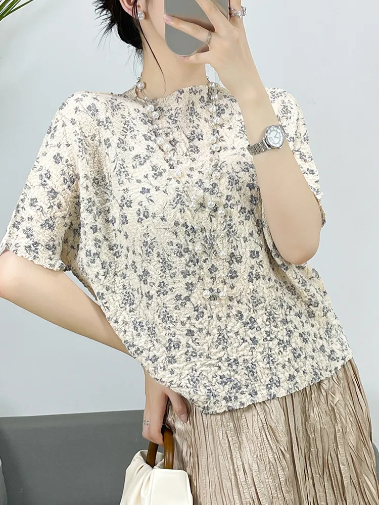衣都精品- 新款時尚優雅小碎花設計褶皺印花上衣