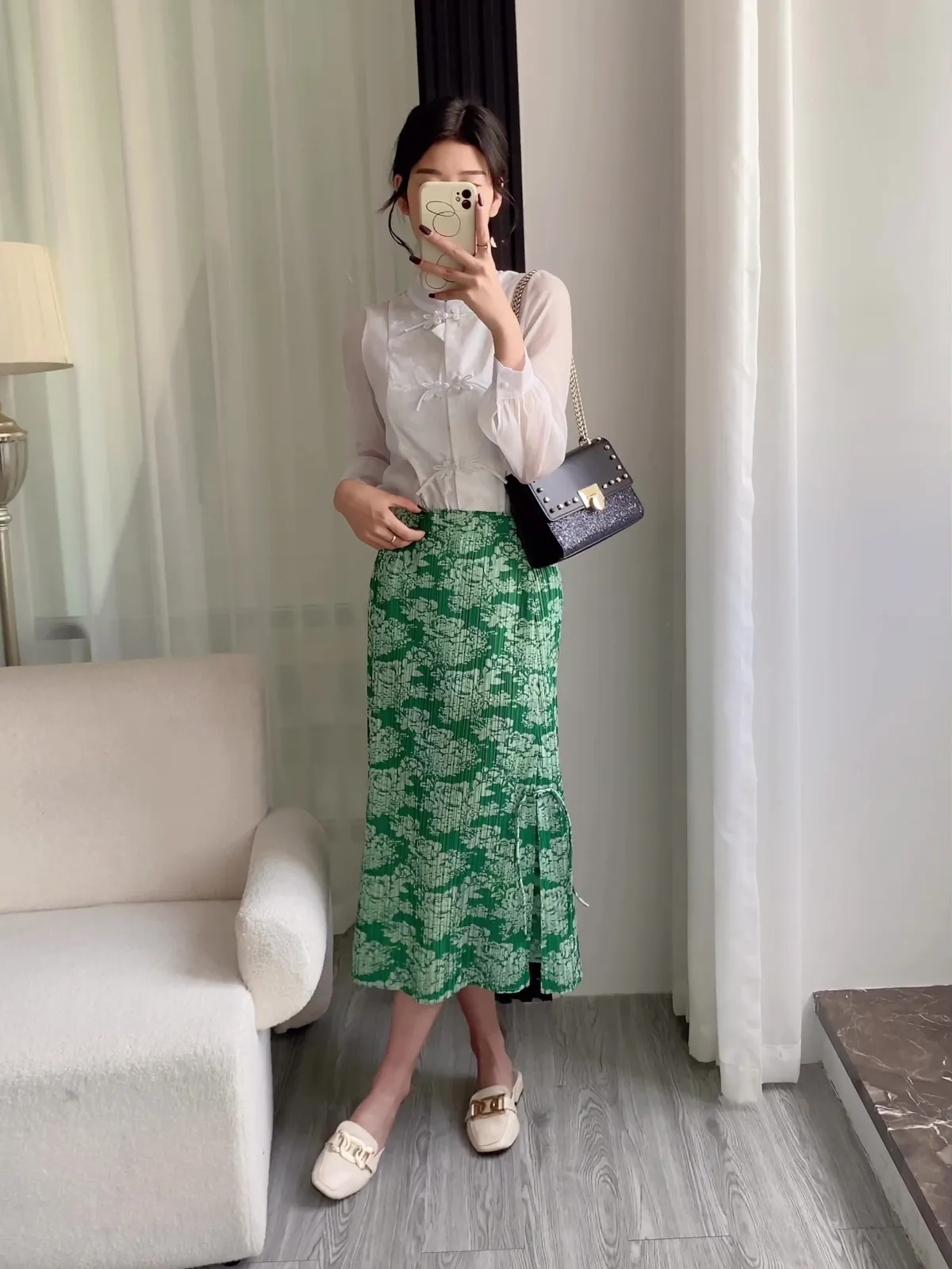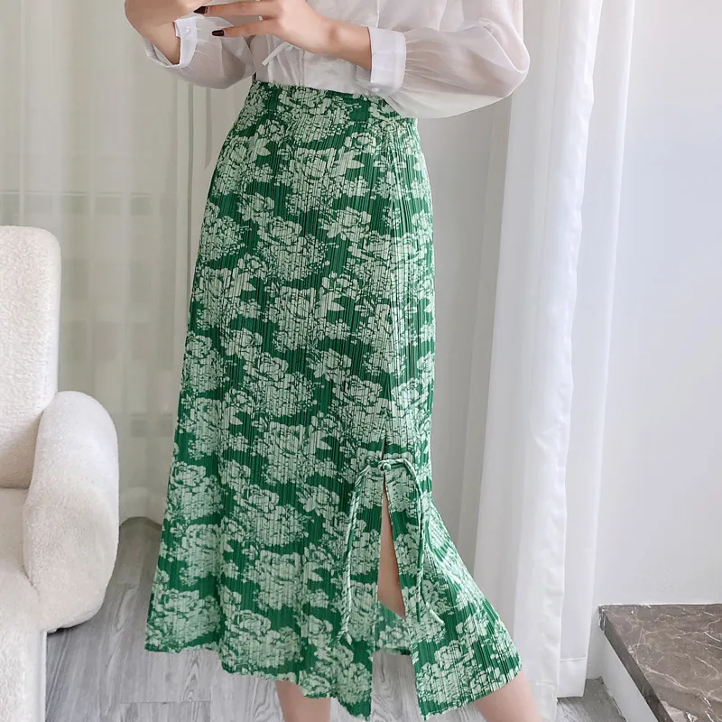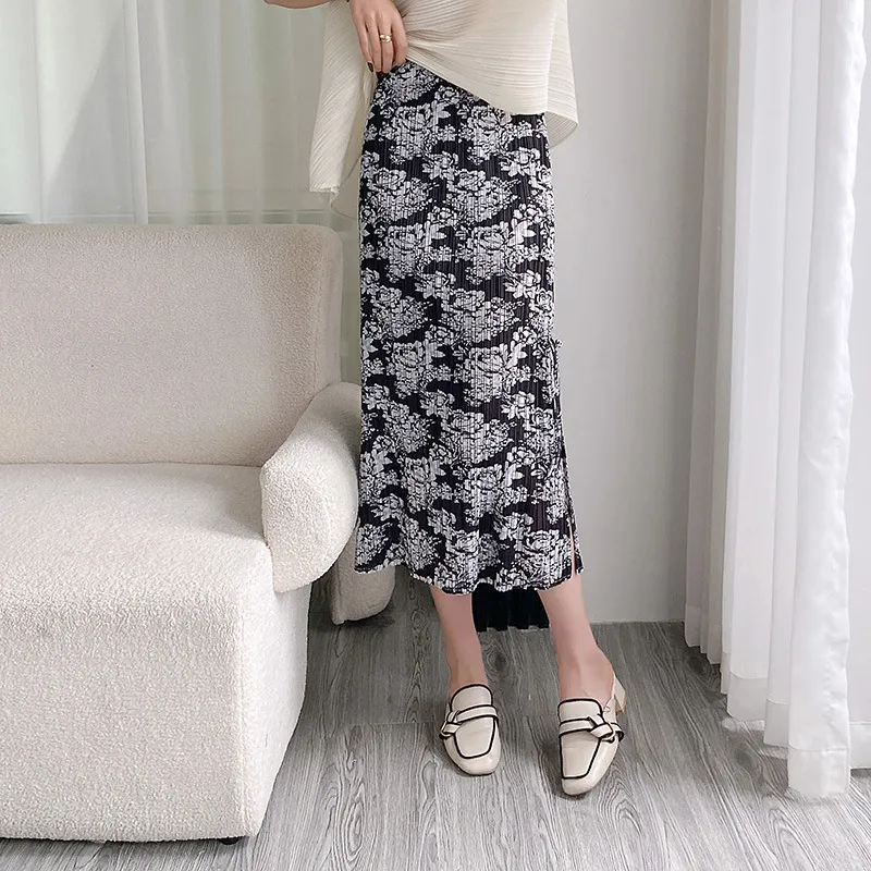 衣都精品- 新款復古印花高腰百搭休閒氣質褶皺半身裙