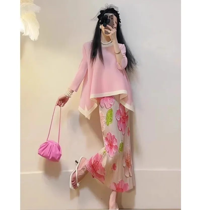 衣都精品- 新款時尚優雅印花大下擺褶皺上衣