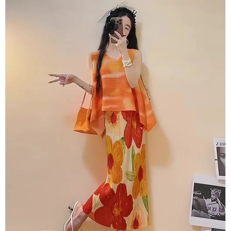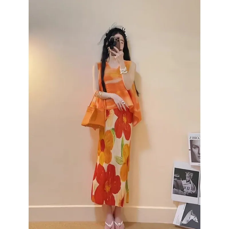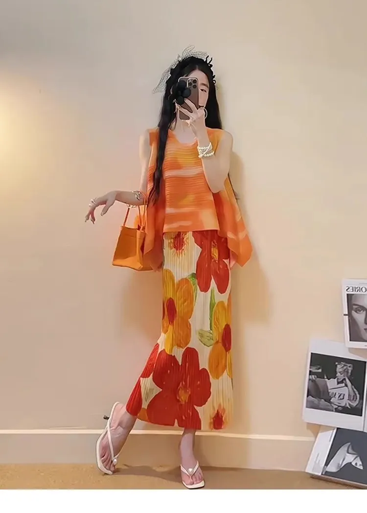 衣都精品- 新款時尚高腰百搭休閒印花褶皺半身裙