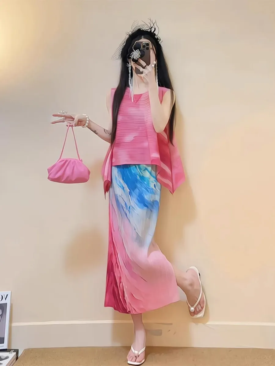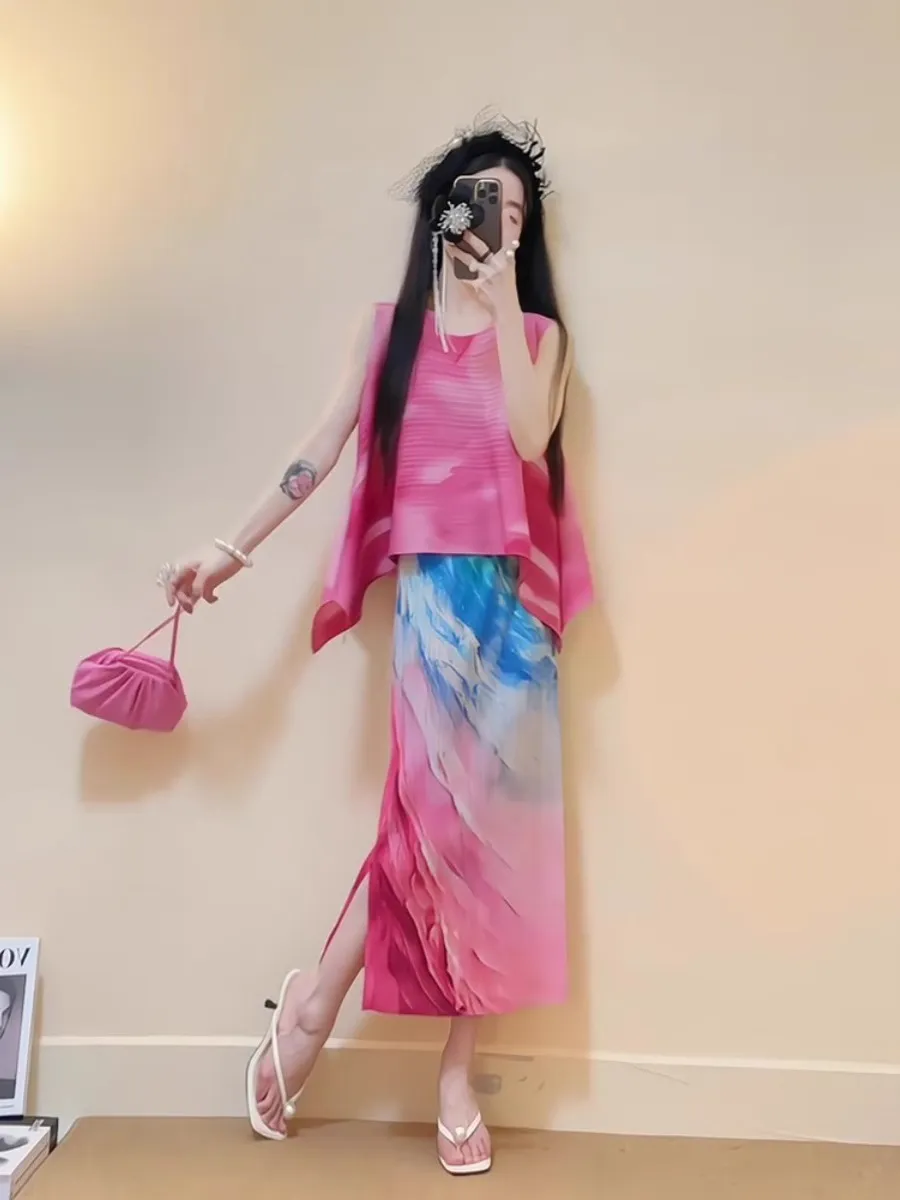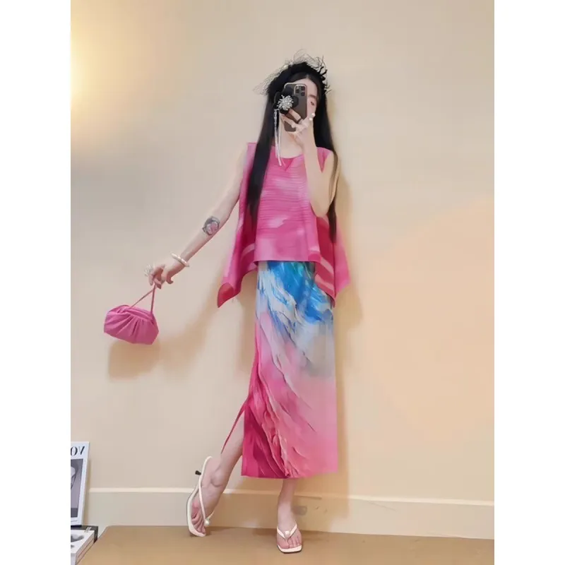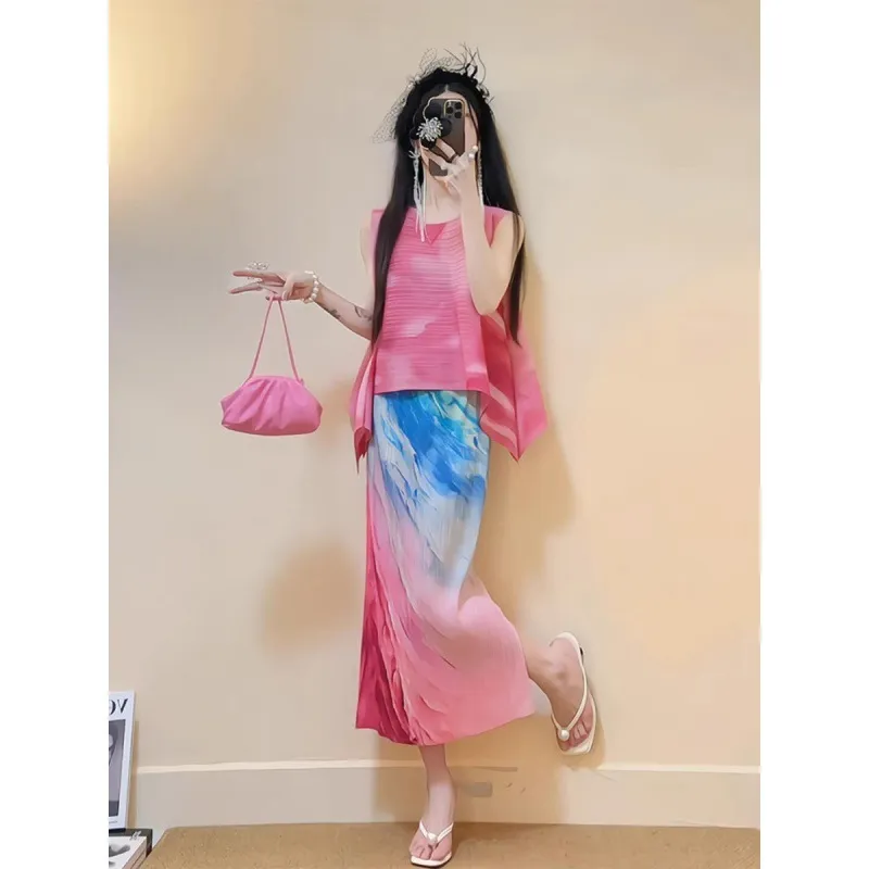 衣都精品- 新款時尚高腰百搭休閒印花褶皺半身裙