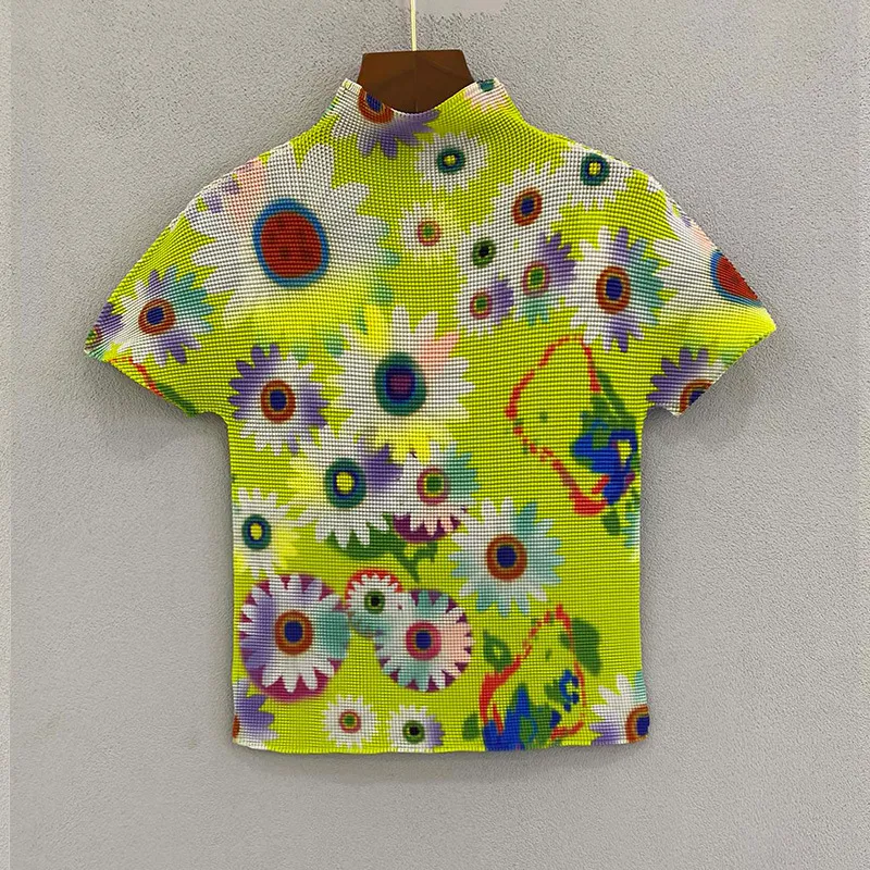 衣都精品- 新款修身顯瘦復古印花半高領褶皺上衣