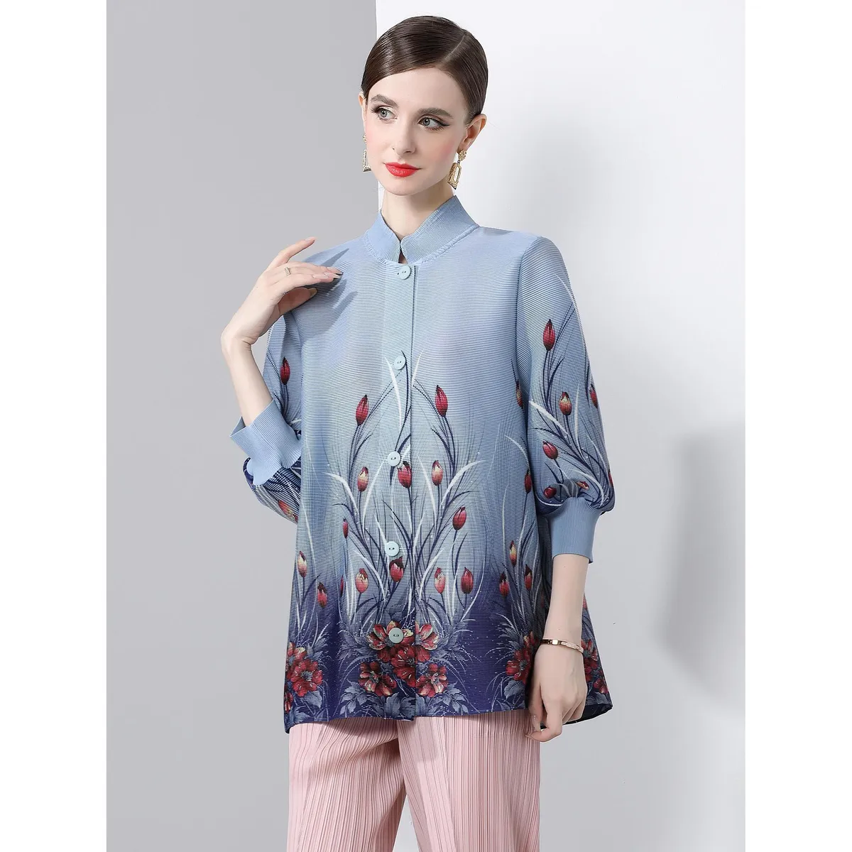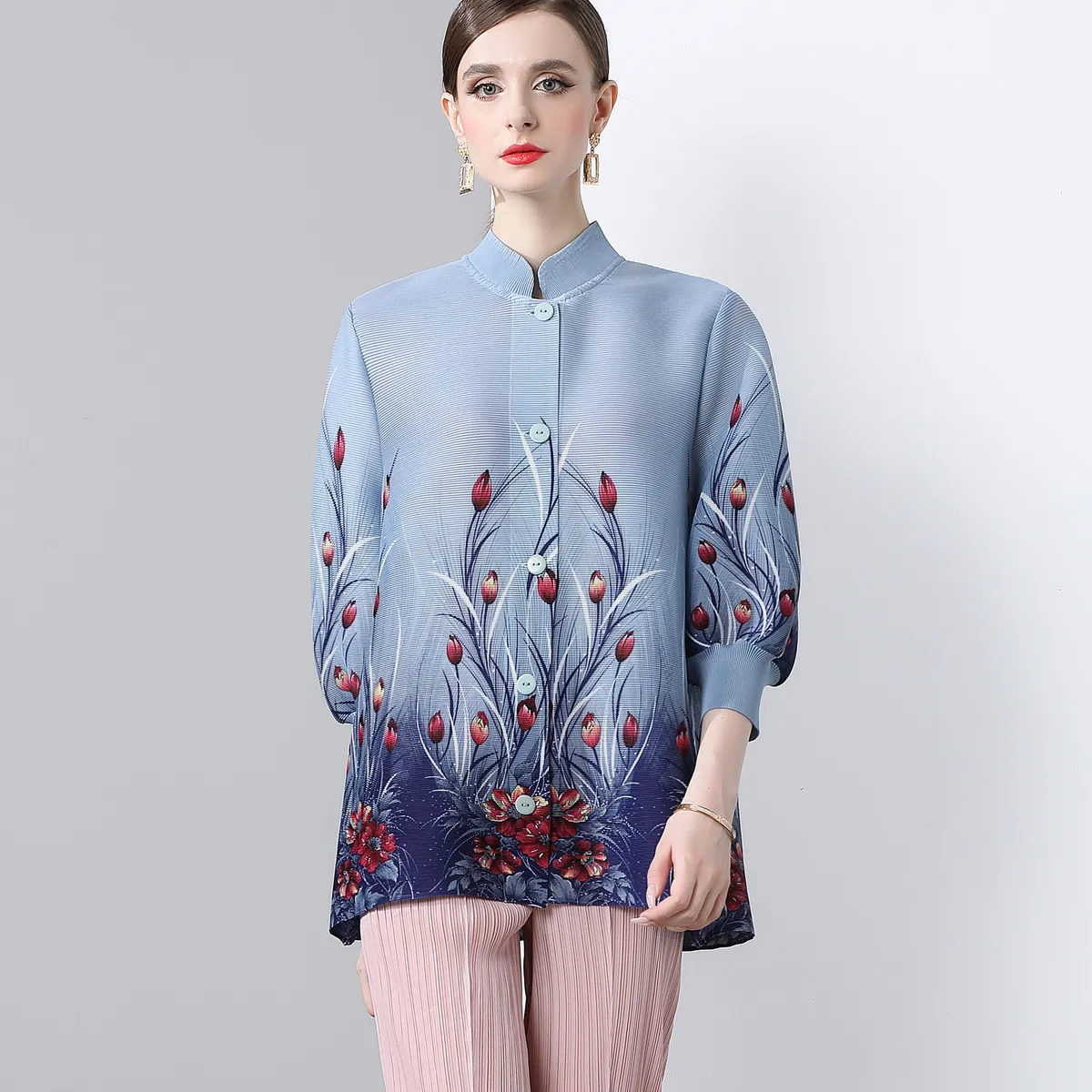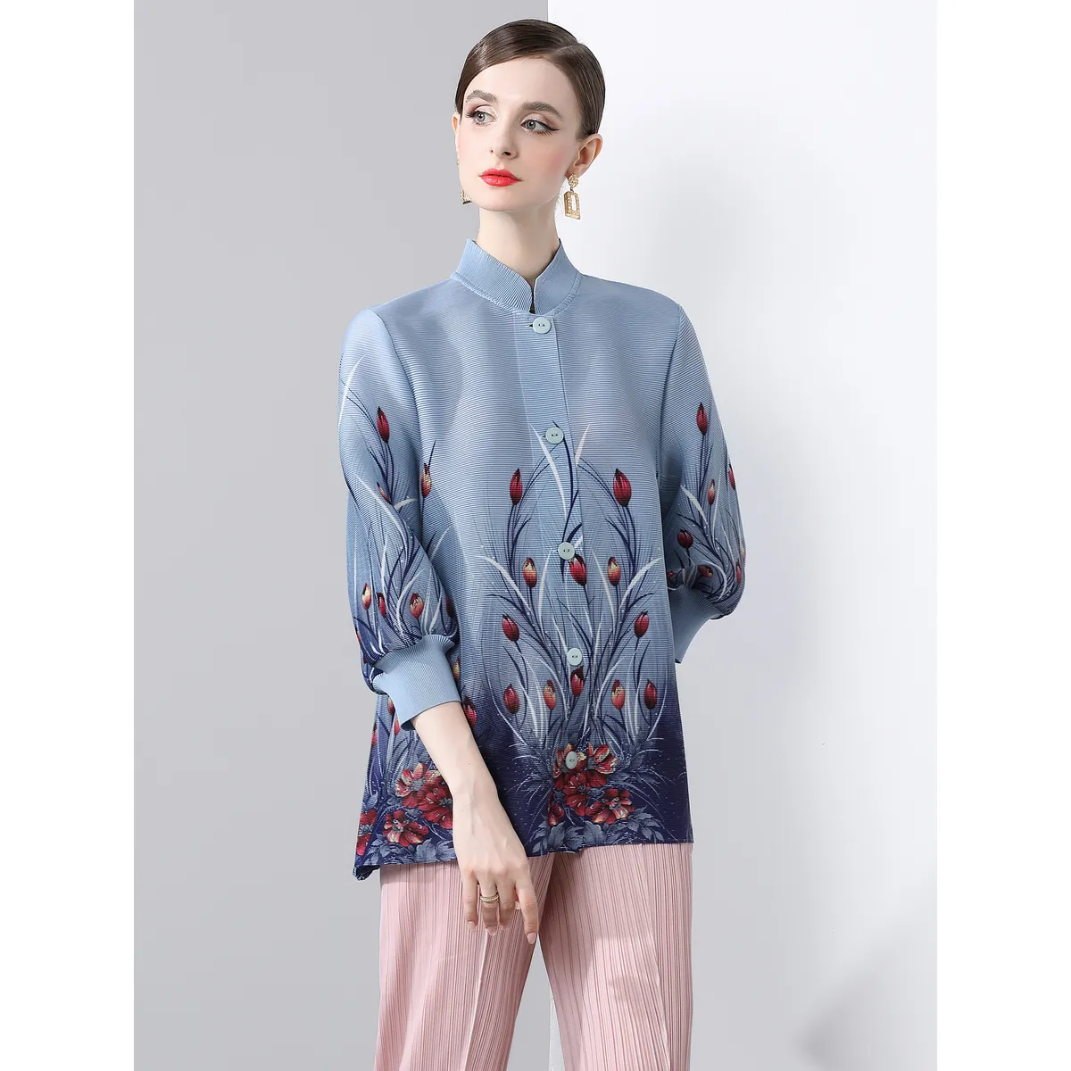 衣都精品- 新款萬叢花卉優雅氣質立領褶皺印花上衣
