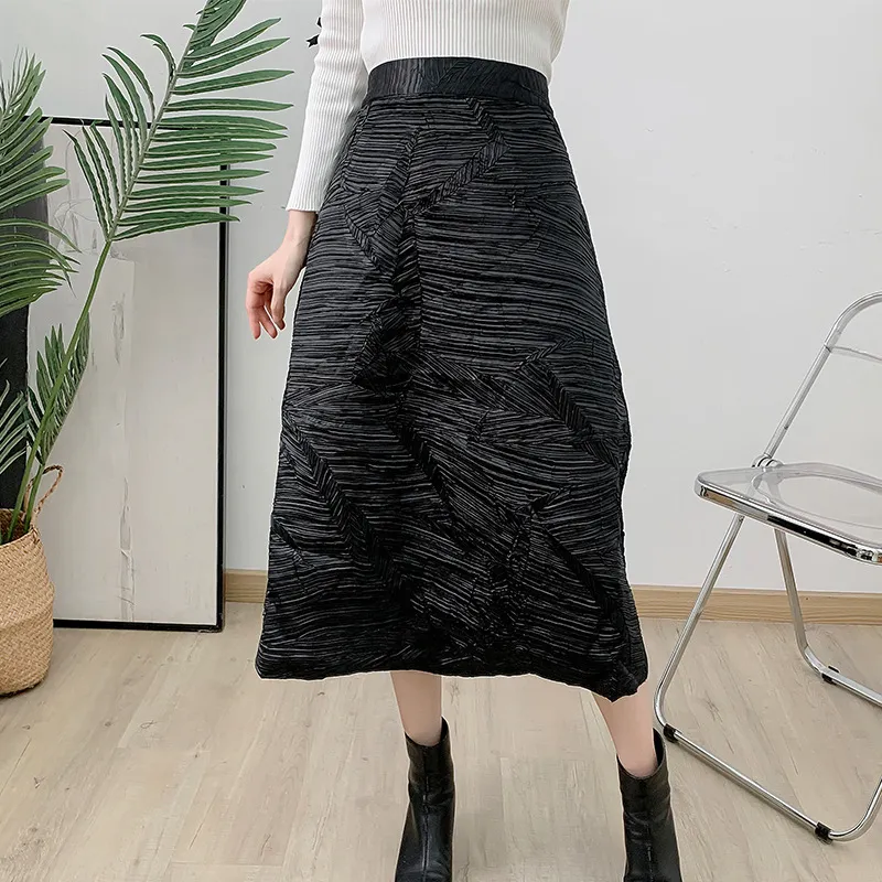 衣都精品- 新款氣質百搭重工繡花純色褶皺半身裙