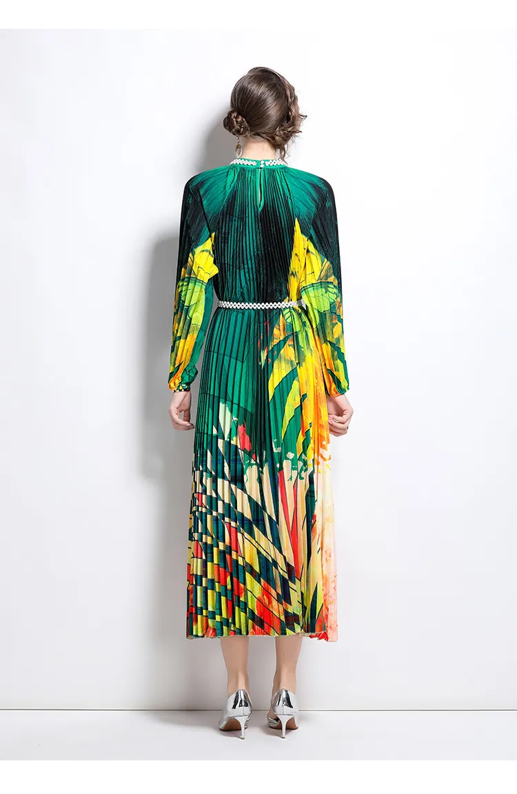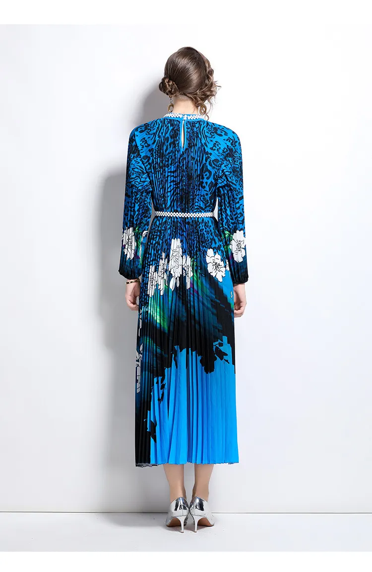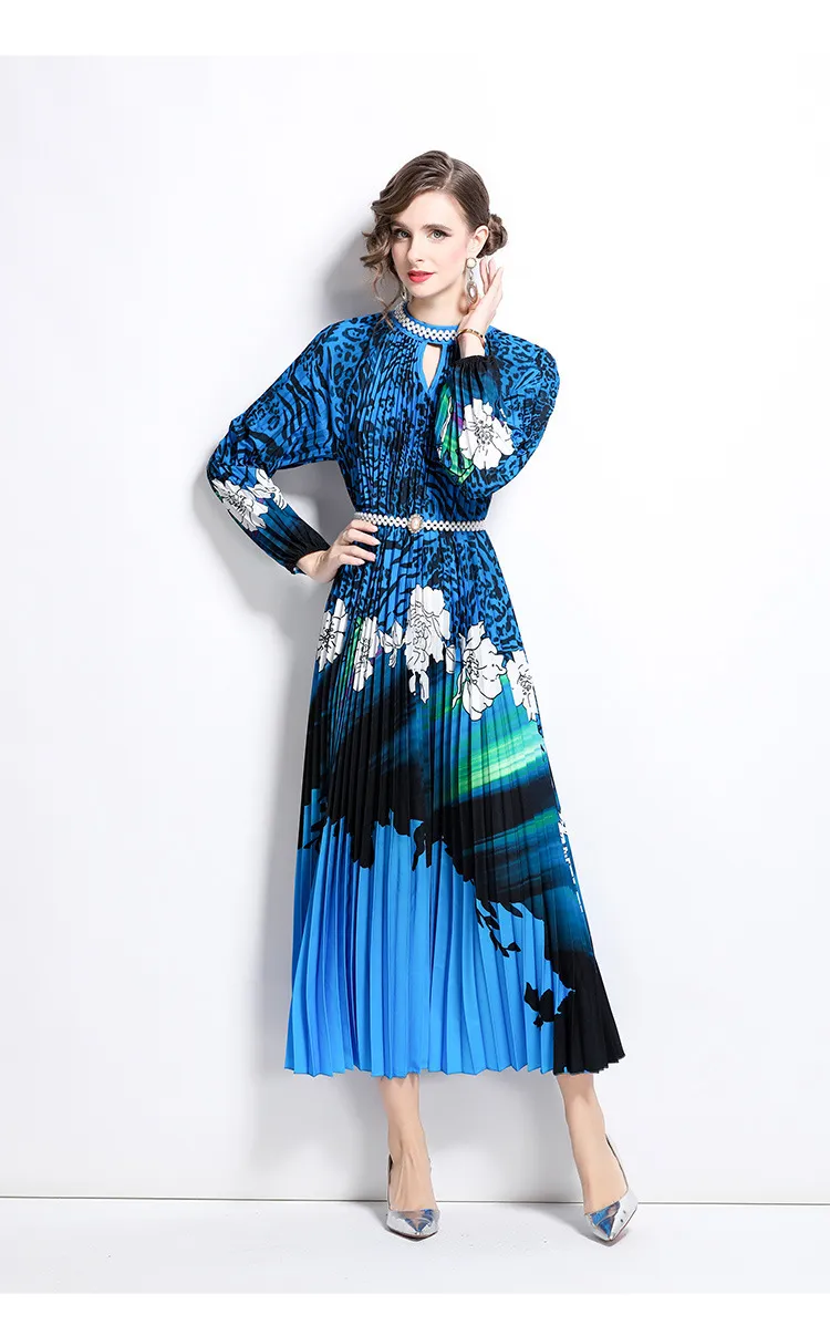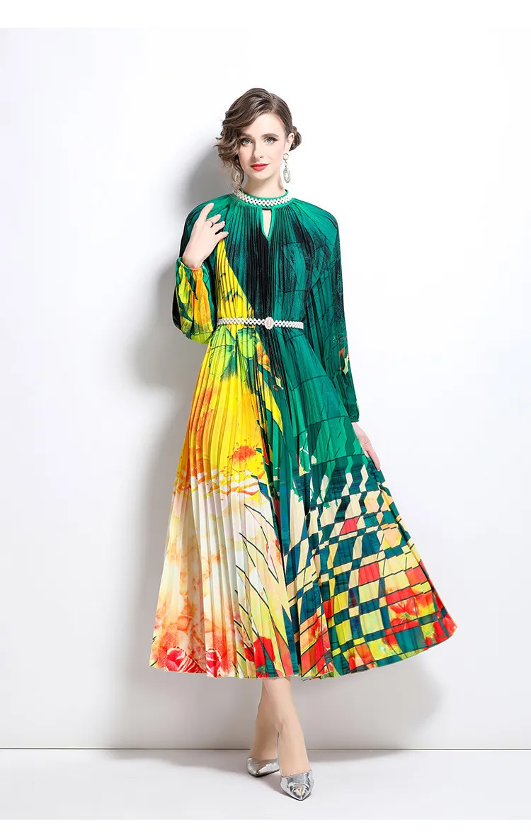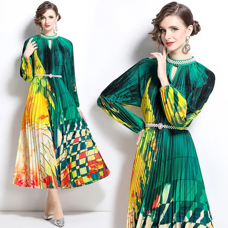 衣都精品- 新款時尚氣質釘珠復古印花百褶連衣裙