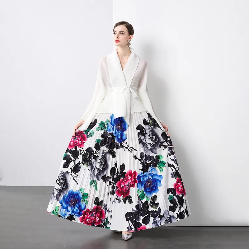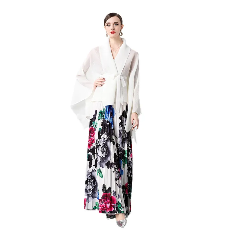 衣都精品- 新款時尚太陽褶純色外披+印花半身裙褶皺套裝