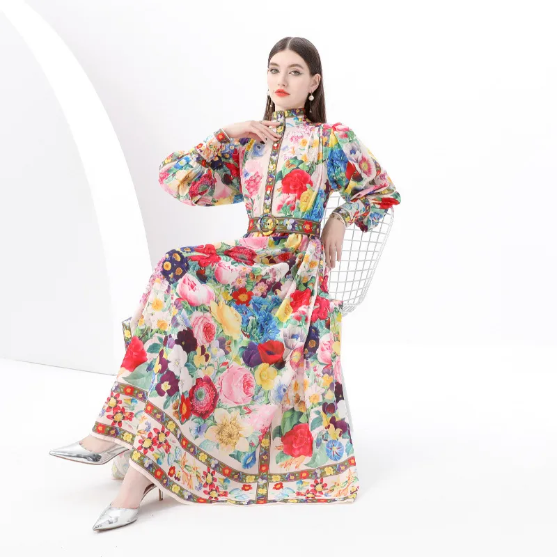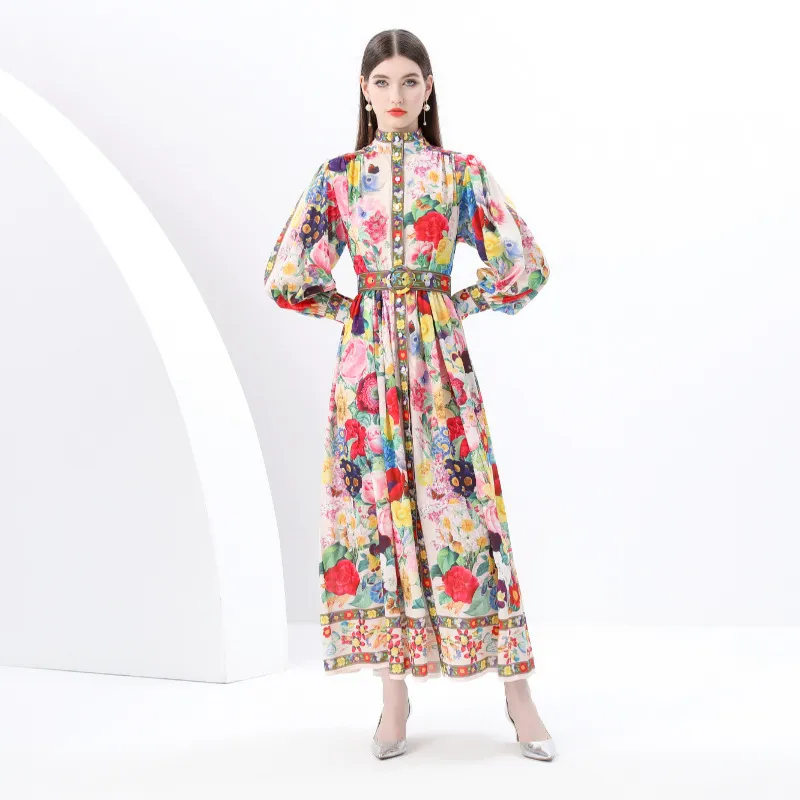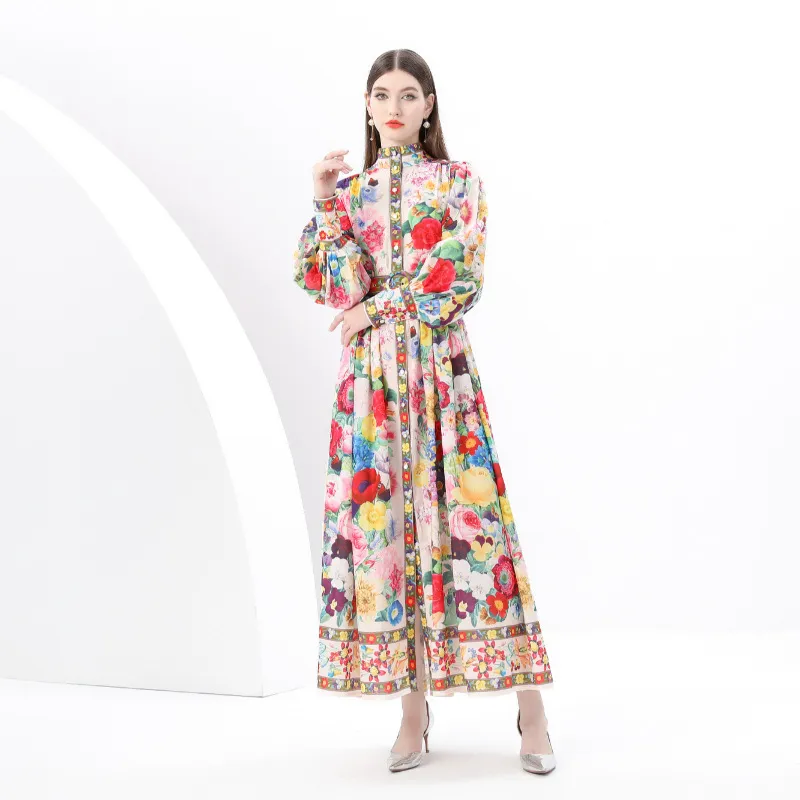衣都精品- 新款時尚彩繪立領燈籠袖大擺連衣裙