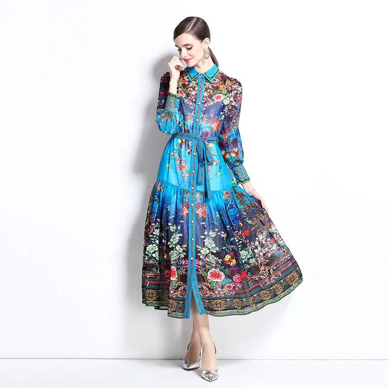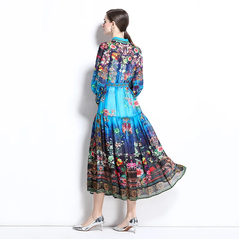衣都精品- 新款時尚彩繪立領燈籠袖大擺連衣裙