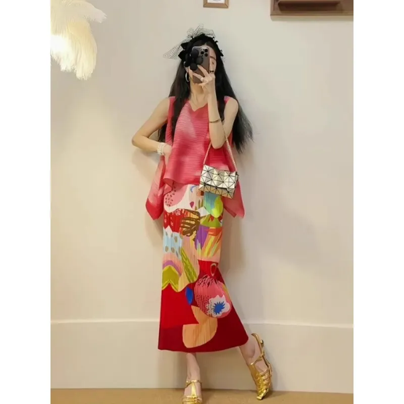 衣都精品- 新款氣質紅色漸變無袖褶皺上衣
