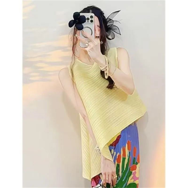 衣都精品- 新款氣質紅色漸變無袖褶皺上衣