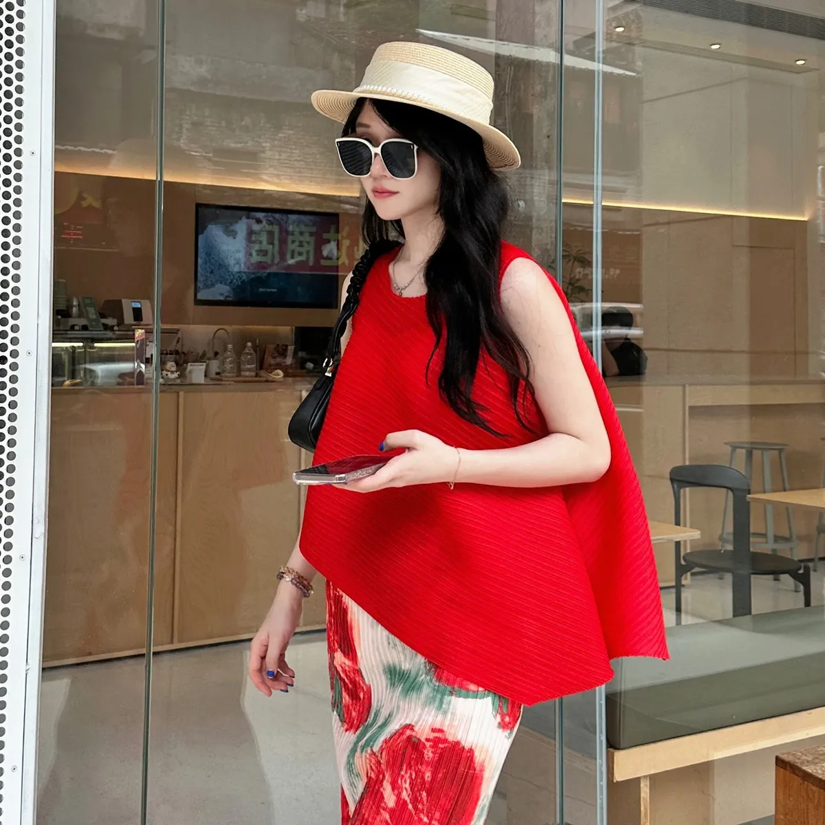 衣都精品- 新款簡約寬鬆印花褶皺半身裙