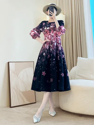 衣都精品- 新款時尚百搭顯瘦花苞法式漸變褶皺連衣裙