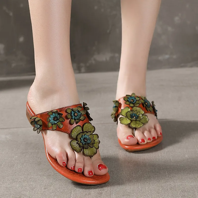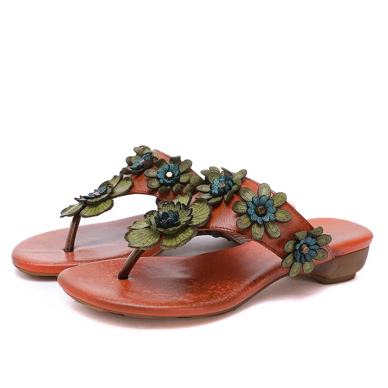衣都精品- 2021春季新款真皮手工花朵人字拖涼鞋
