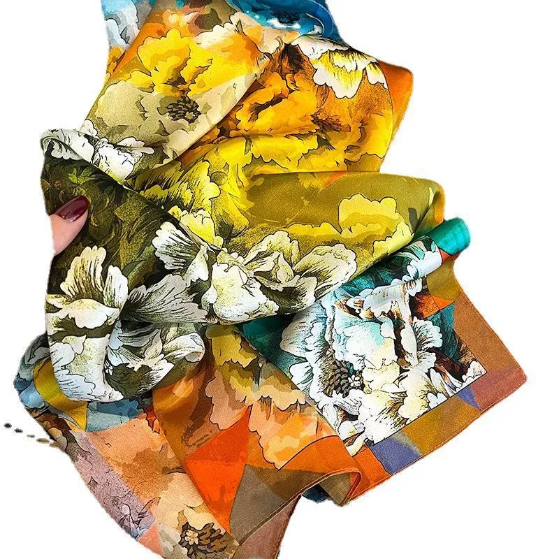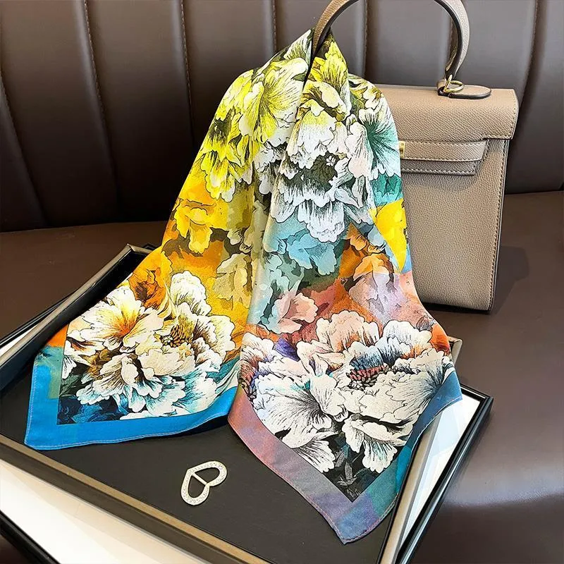 衣都精品- 2022冬季新款藍黃牡丹百搭真絲中方巾