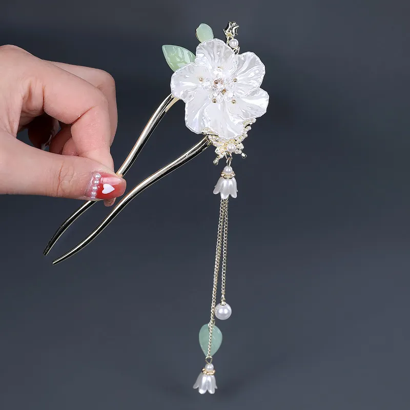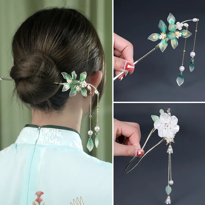 衣都精品- 2022冬季新款復古透綠花朵流蘇發簪
