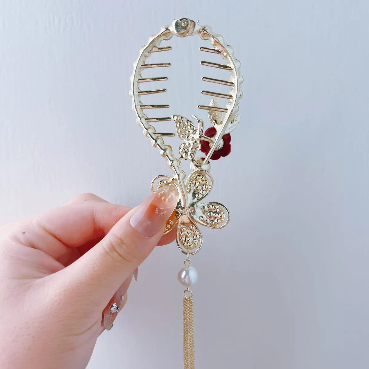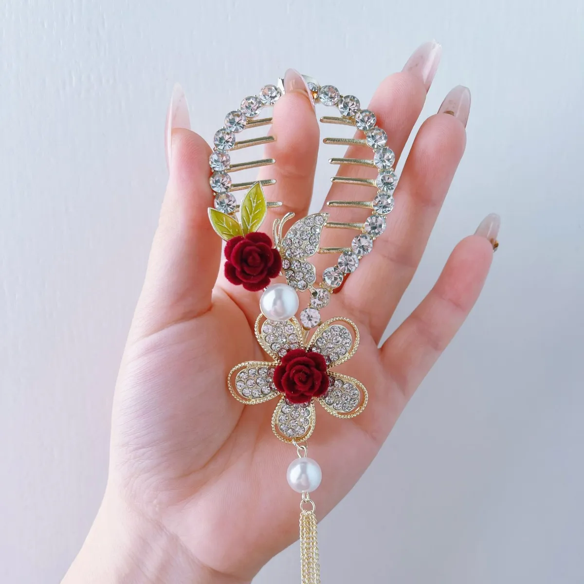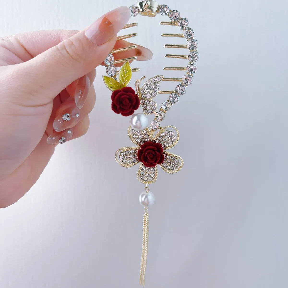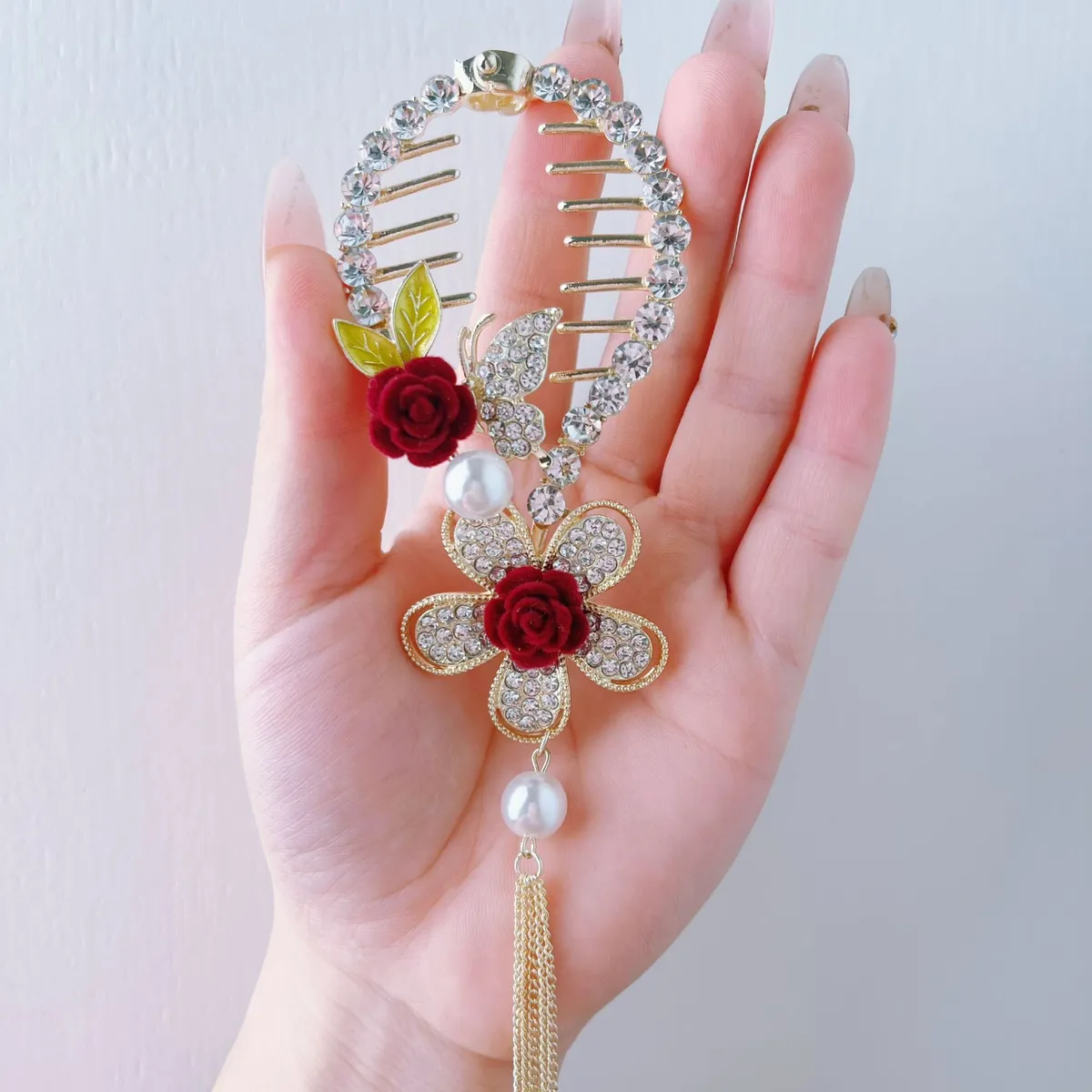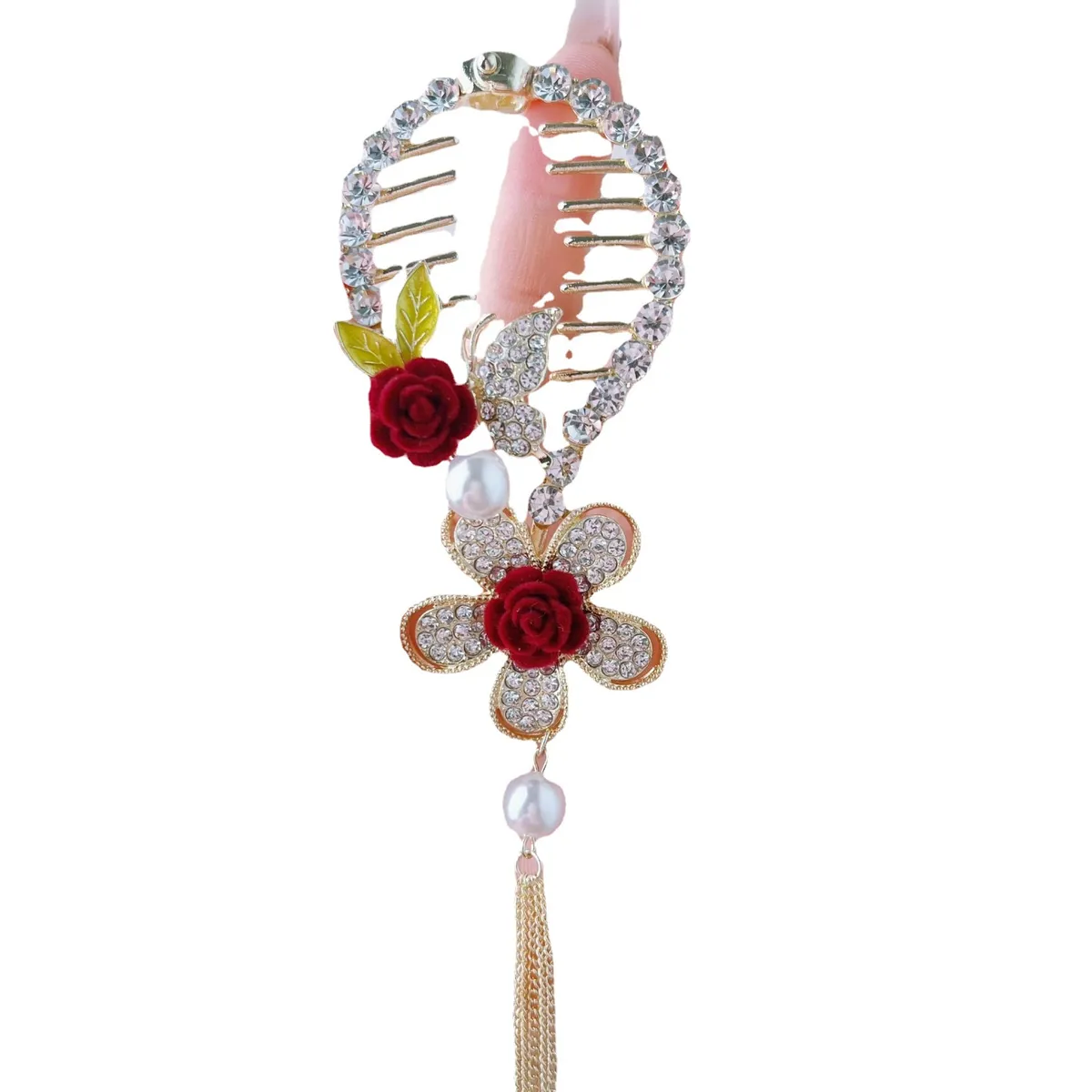 衣都精品- 2022冬季新款超仙玫瑰珍珠流蘇馬尾夾髮飾