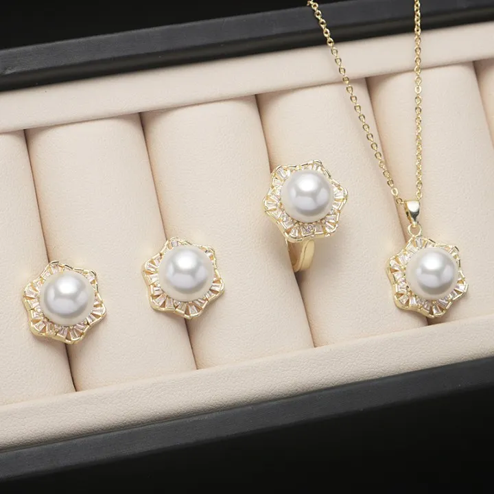 衣都精品- 2023新款時尚貝殼珍珠項鍊+戒指+耳環首飾套裝