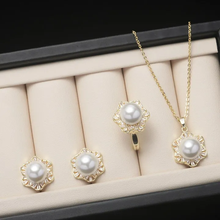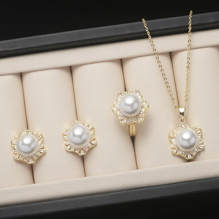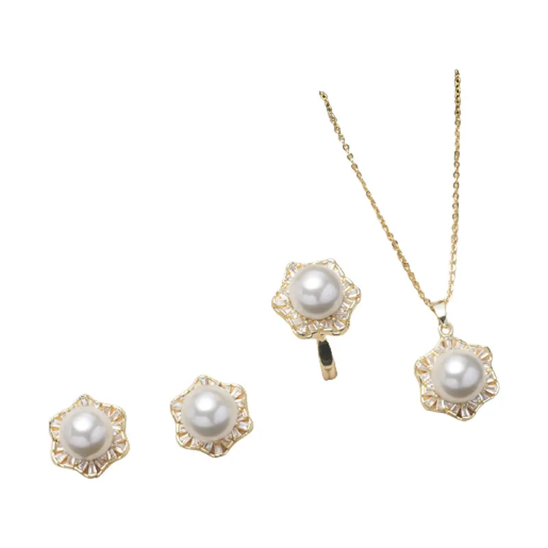 衣都精品- 2023新款時尚六角星貝珠項鍊+戒指+耳環首飾套裝