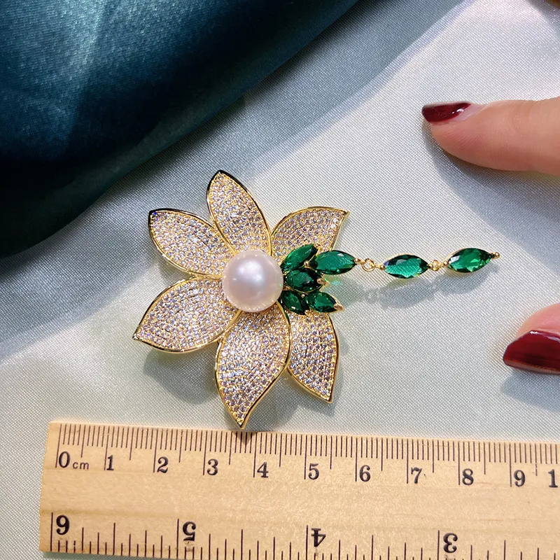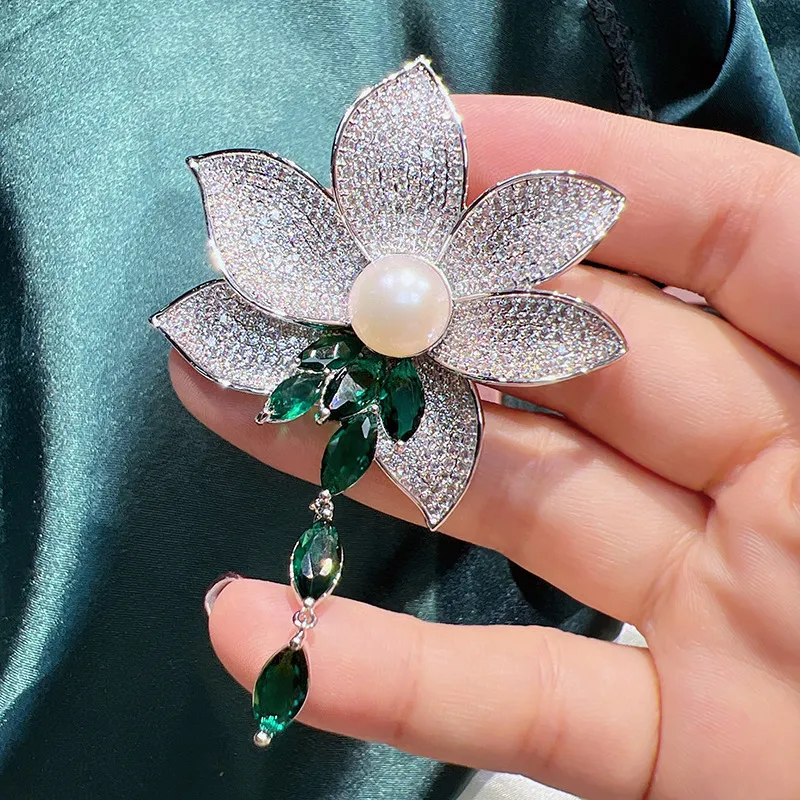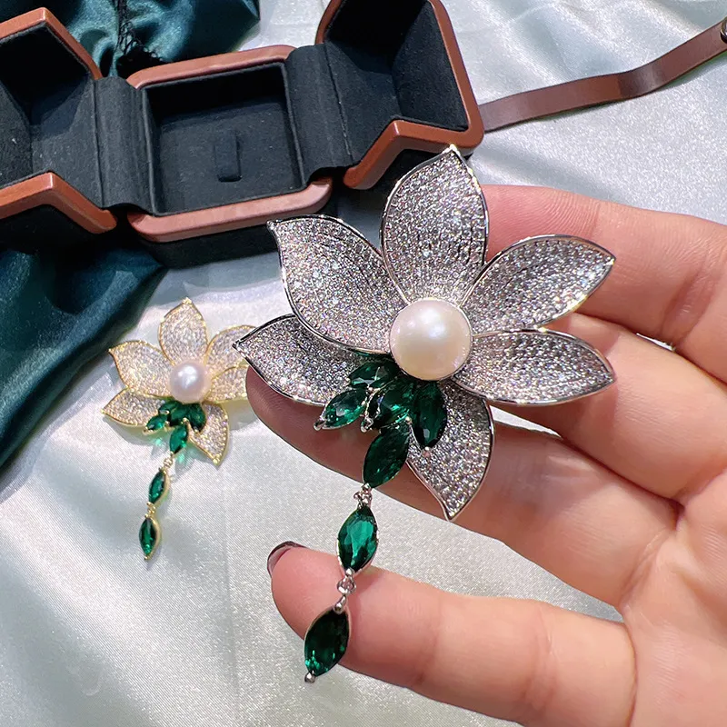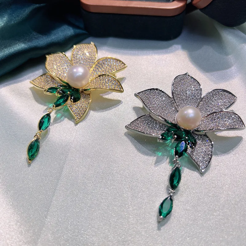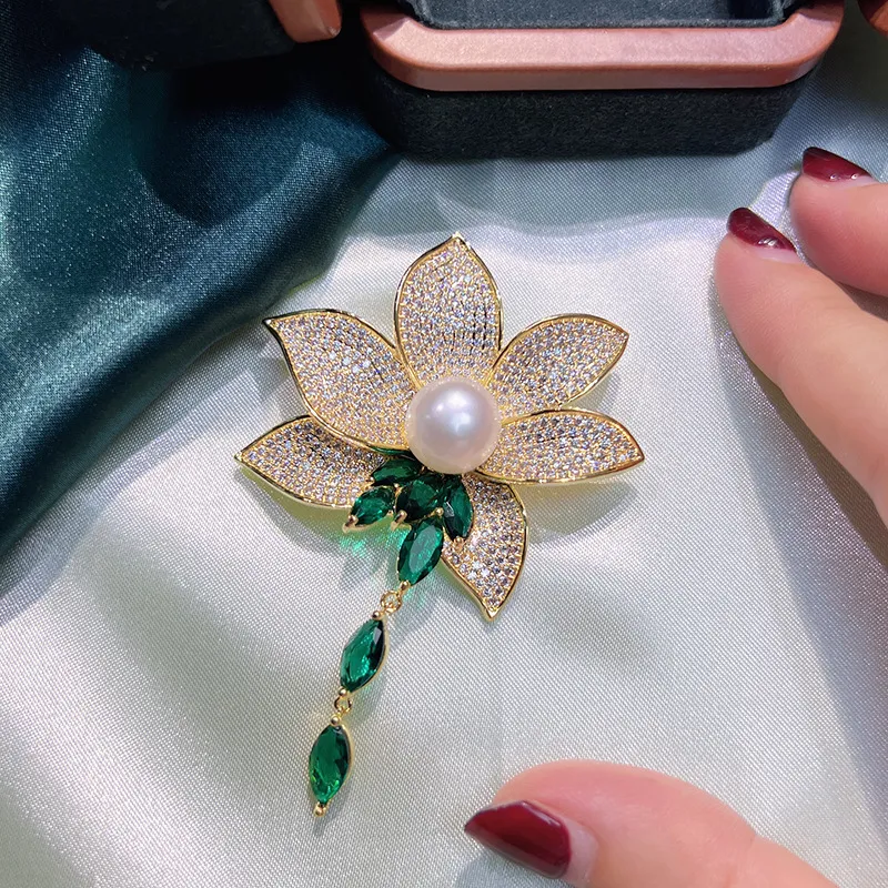 衣都精品- 2023新款優雅祖母綠蓮花流蘇珍珠胸針