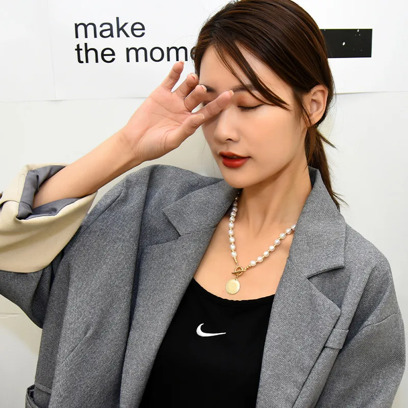 衣都精品- 2023新款韓版珍珠圓牌愛心拼接鈦鋼項鍊