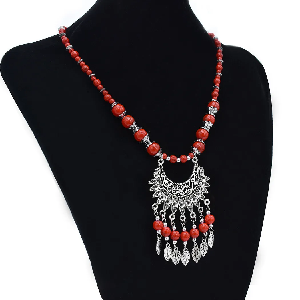 衣都精品- 2023新款民族風紅色松石葉流蘇項鍊