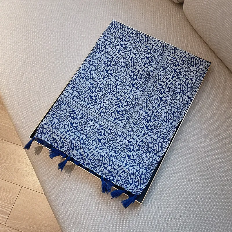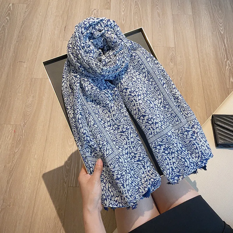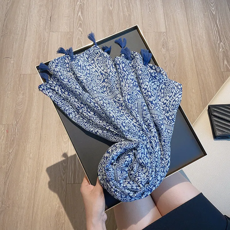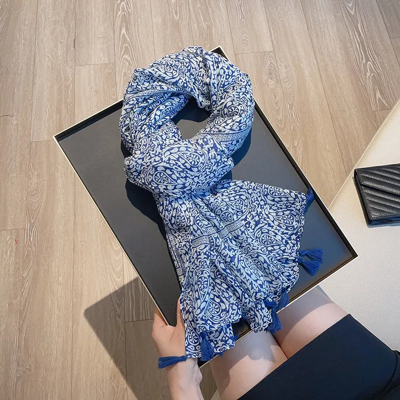 衣都精品- 2023新款民族風青花瓷流蘇防曬披肩圍巾