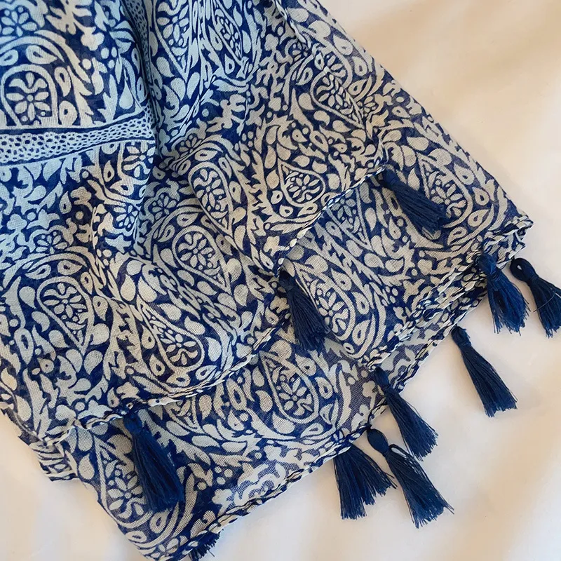 衣都精品- 2023新款民族風蠟染藍染流蘇工藝棉圍巾