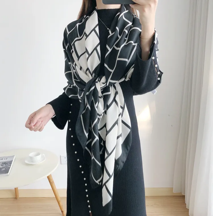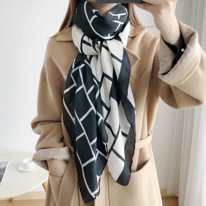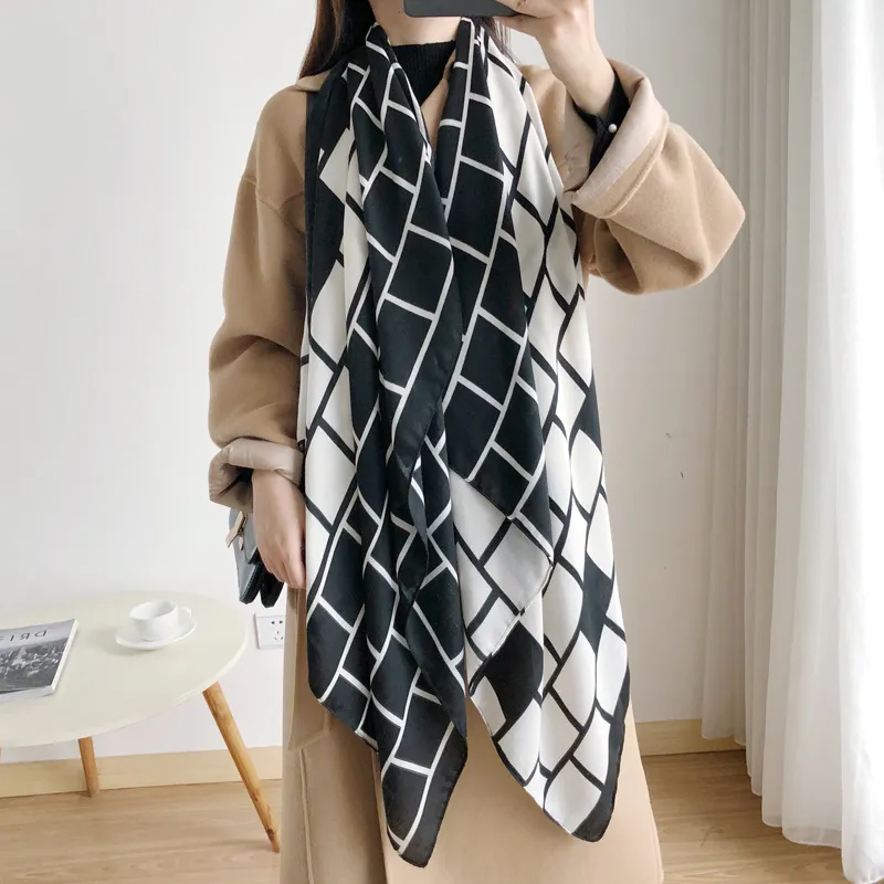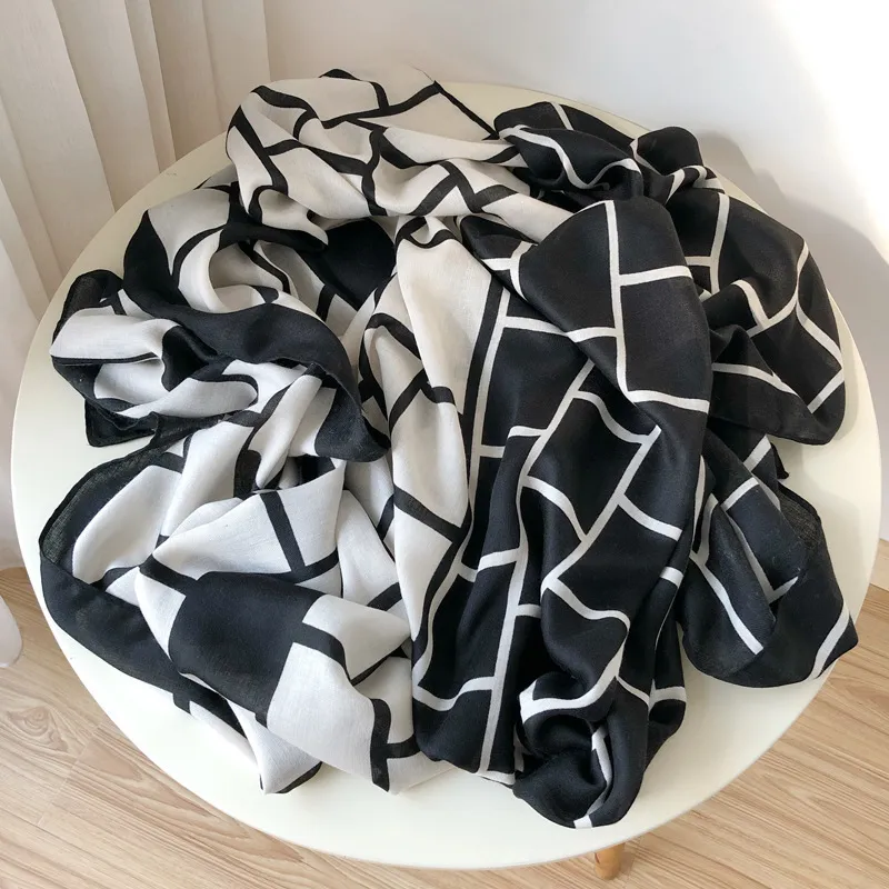 衣都精品- 2023新款百搭黑白大格紋撞色棉麻圍巾
