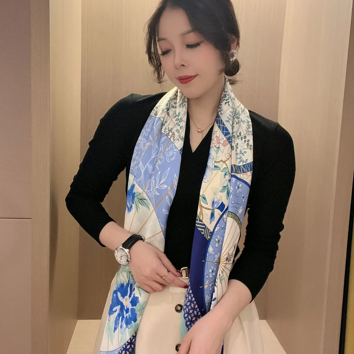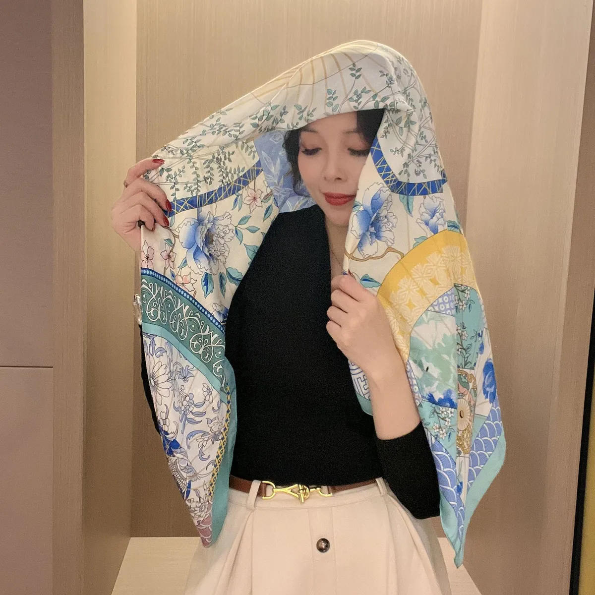 衣都精品- 2023新款中國風青花瓷牡丹印花麗錦鍛絲巾