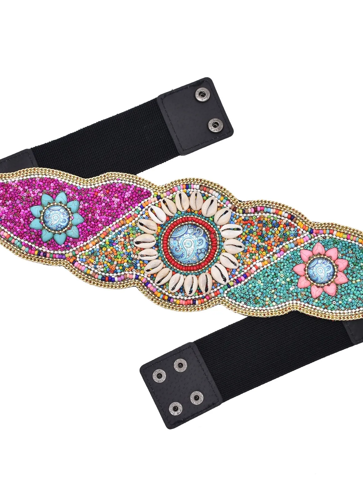 衣都精品- 新款復古米珠貝殼少數民族鬆緊束腰帶