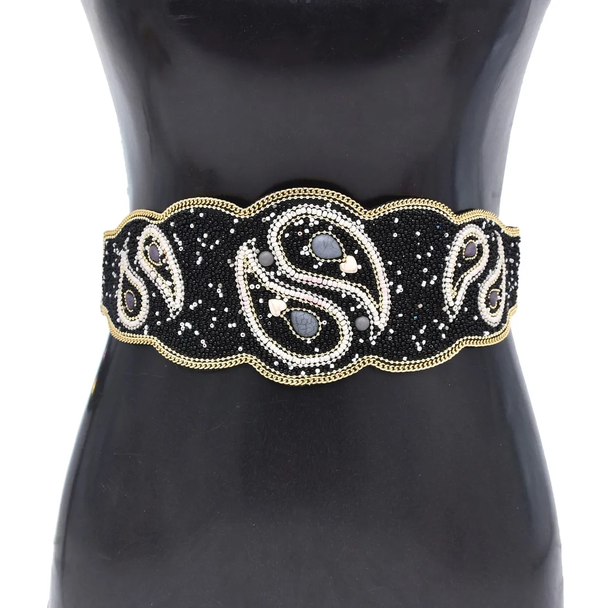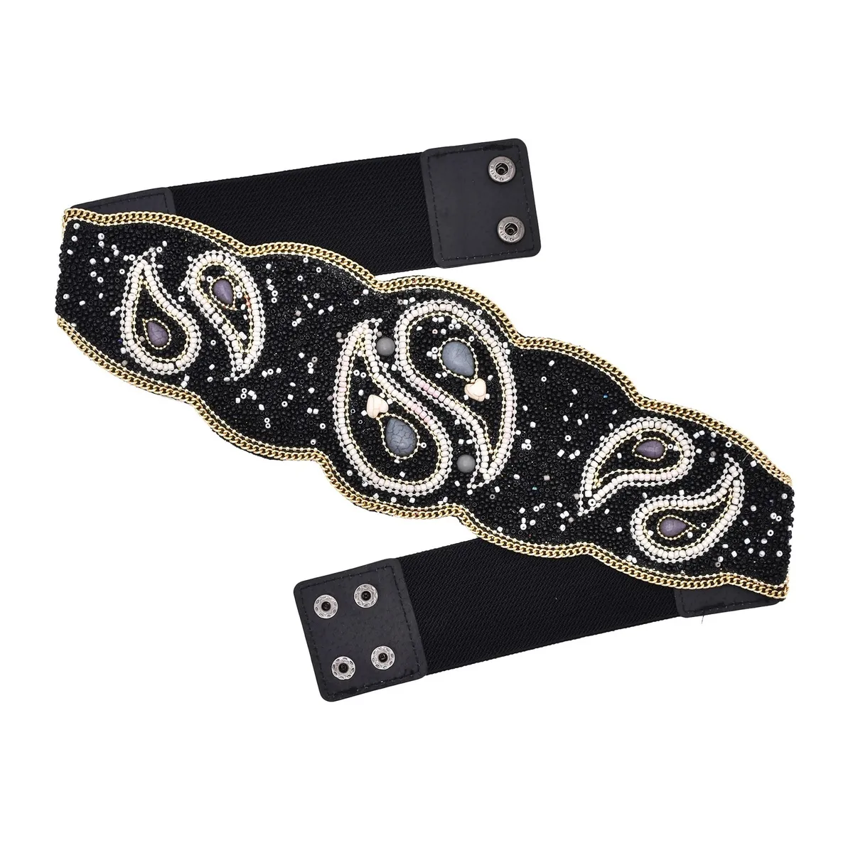 衣都精品- 新款西藏太極圖案彩色米珠按扣鬆緊寬腰帶
