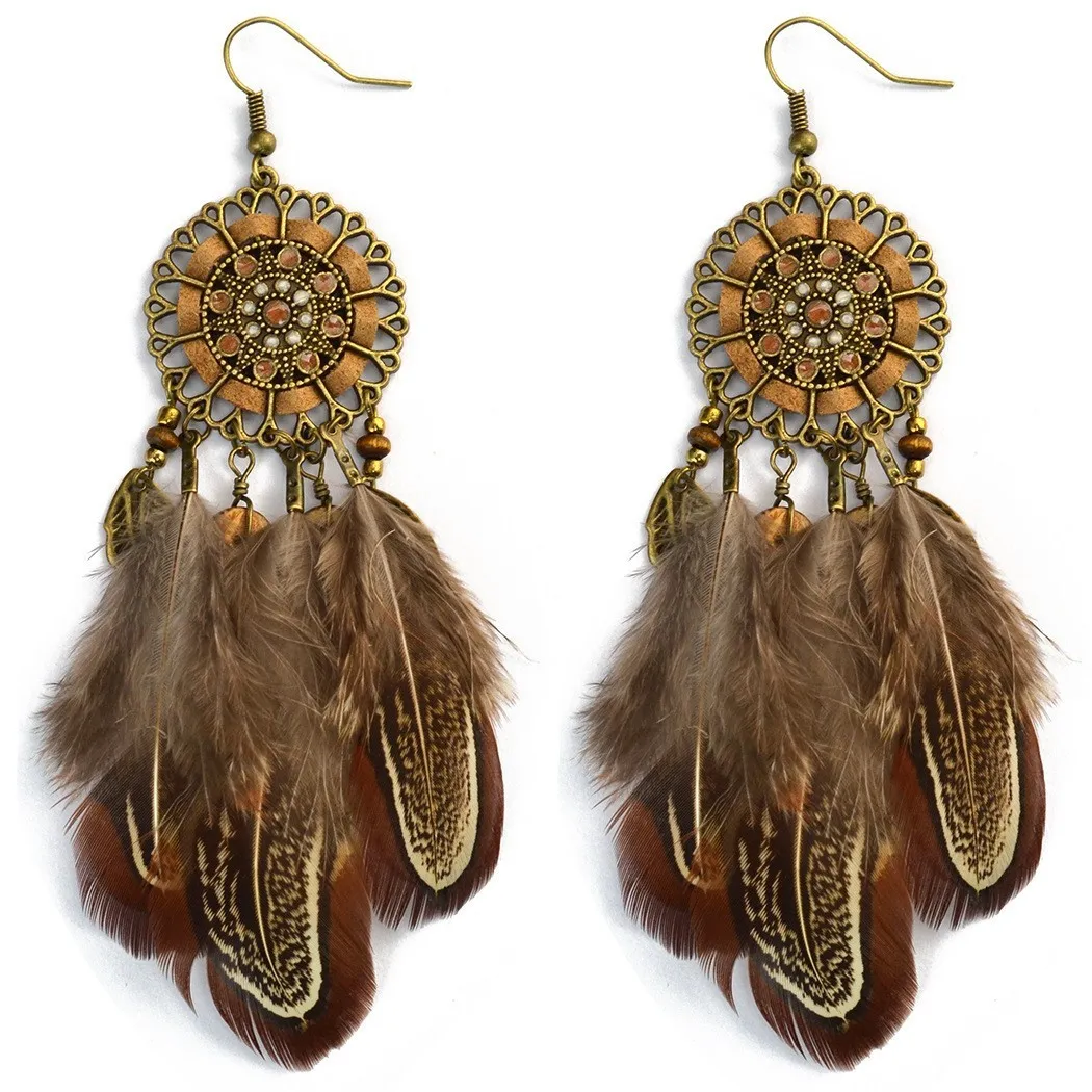 衣都精品- 新款異國風情圓形鏤空滴油多片羽毛耳環