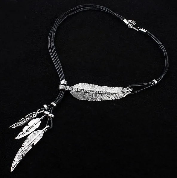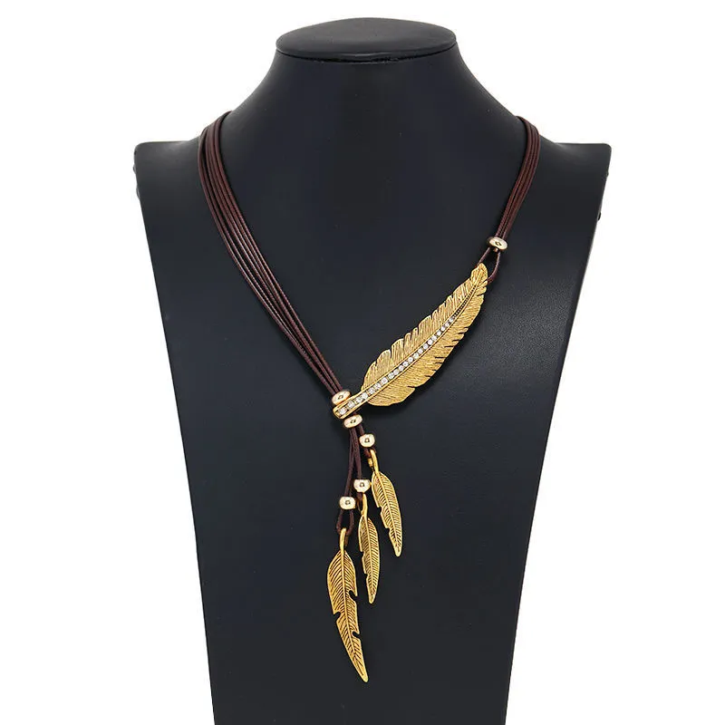 衣都精品- 新款歐美風羽毛樹葉鑲鑽多層流蘇項鍊