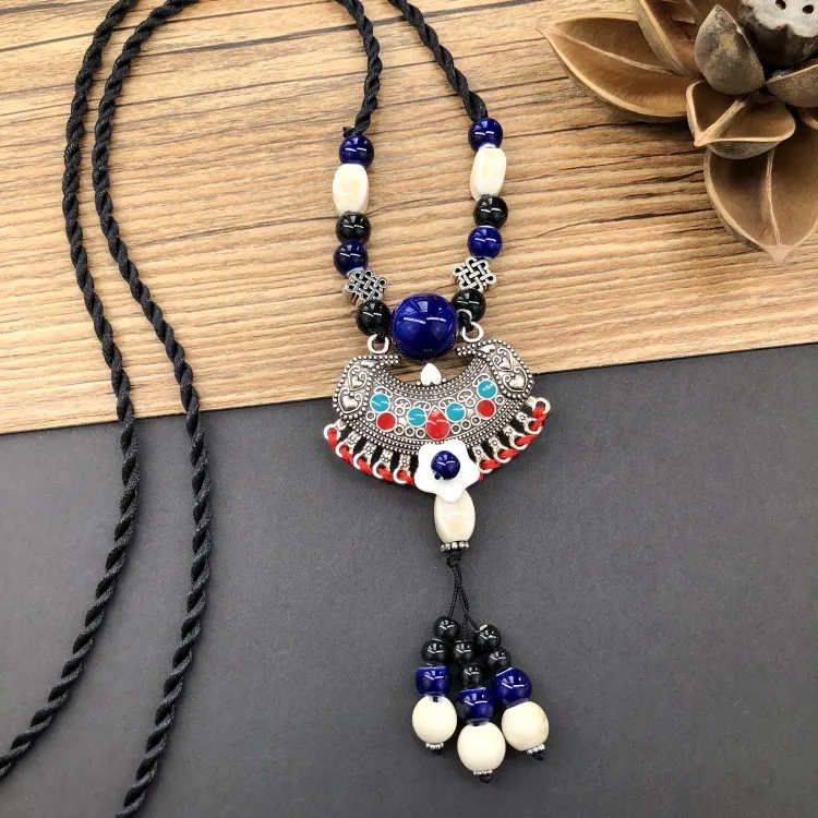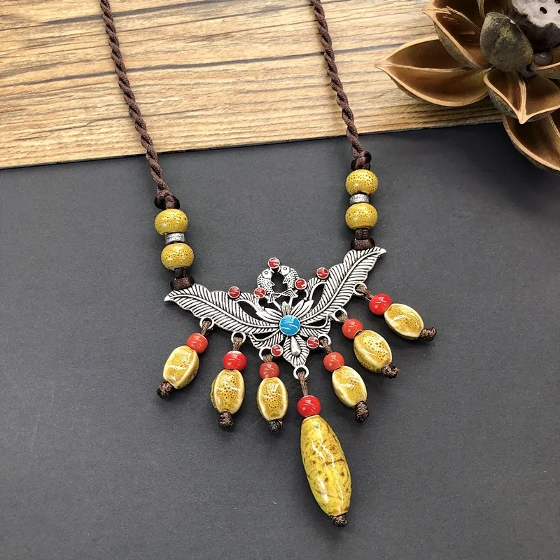 衣都精品- 新款民族風復古文藝棉麻陶瓷項鍊