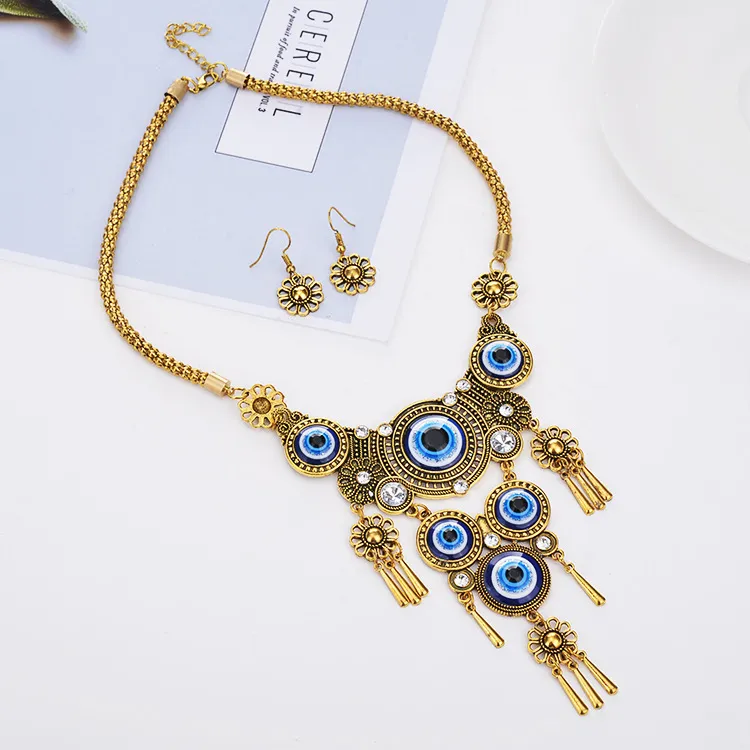 衣都精品- 新款歐美復古個性土耳其藍眼睛項鍊+耳環套裝