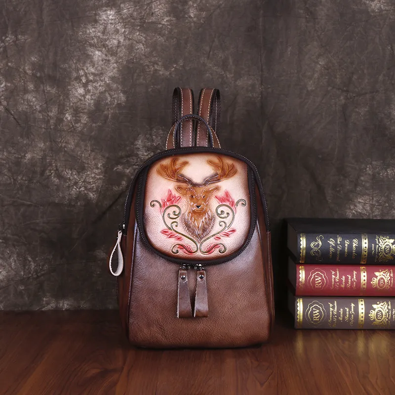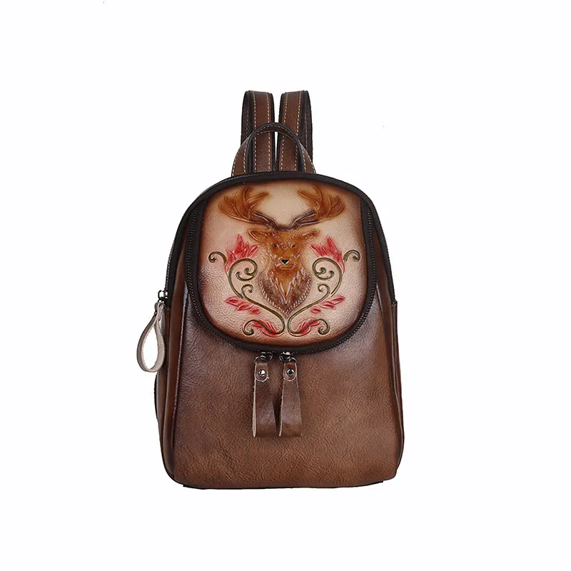 衣都精品- 新款頭層牛皮復古壓花時尚雙肩包