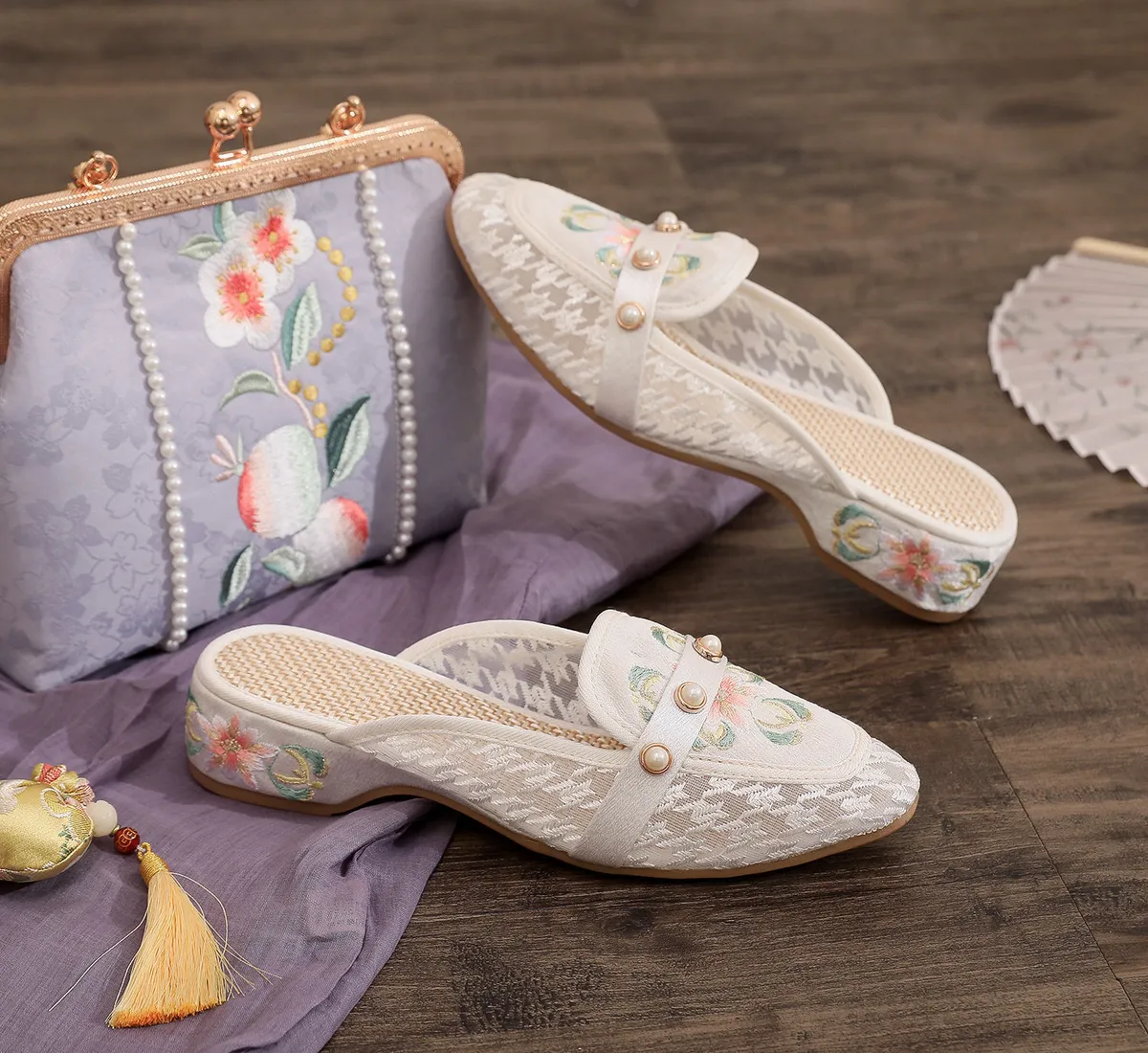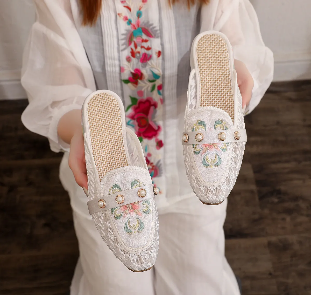衣都精品- 新款平底方頭網紗透氣百搭繡花拖鞋
