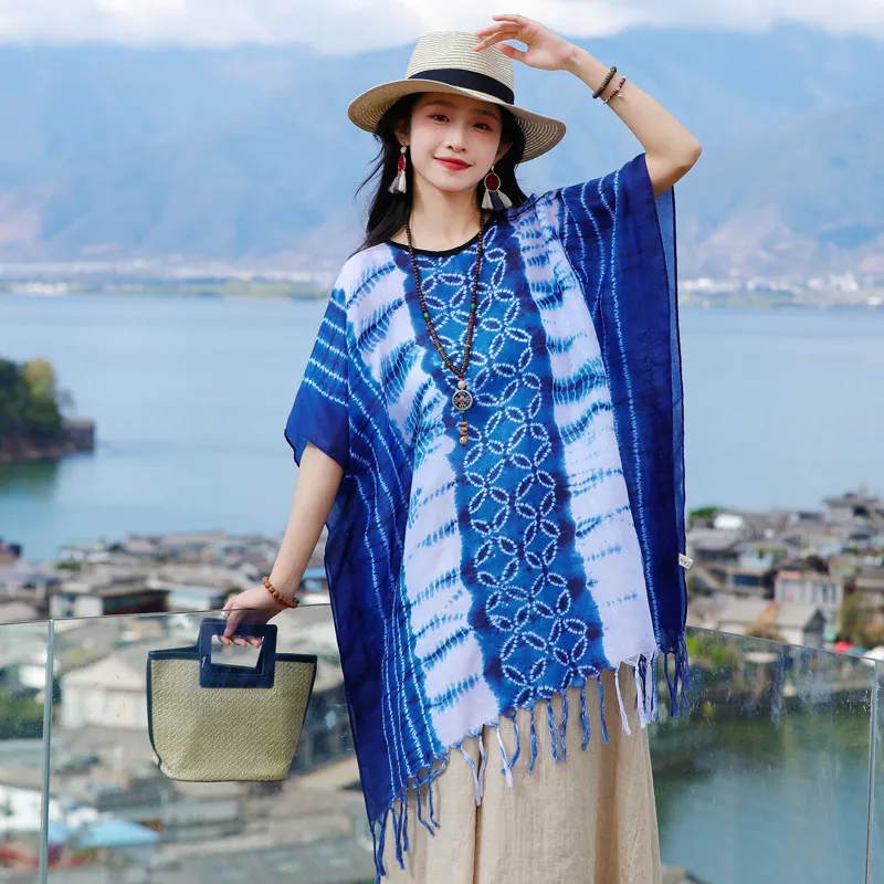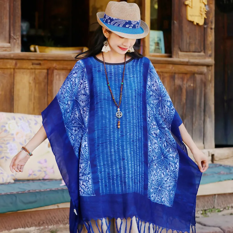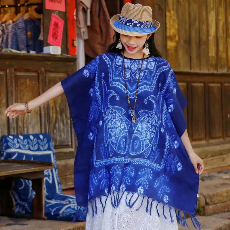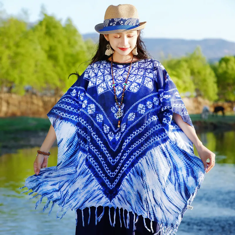 衣都精品- 新款百搭民族風藍色流蘇斗篷披肩
