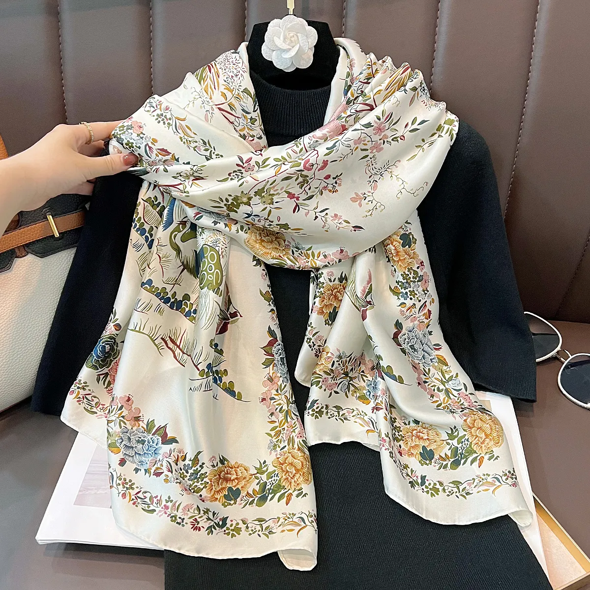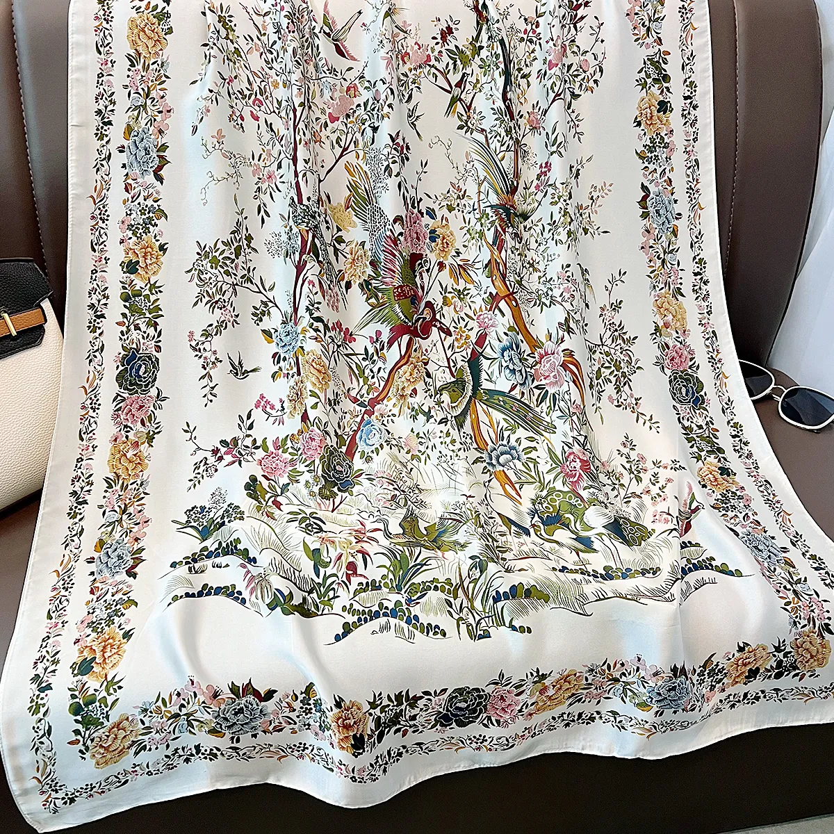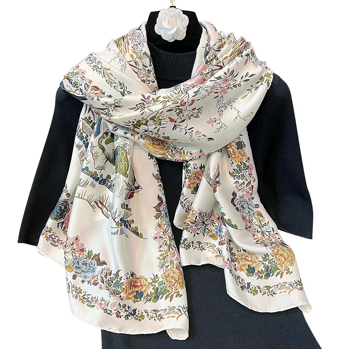 衣都精品- 新款中國風花鳥圖長款印花絲巾