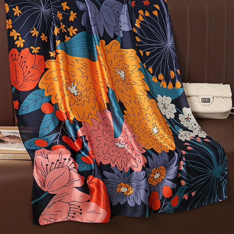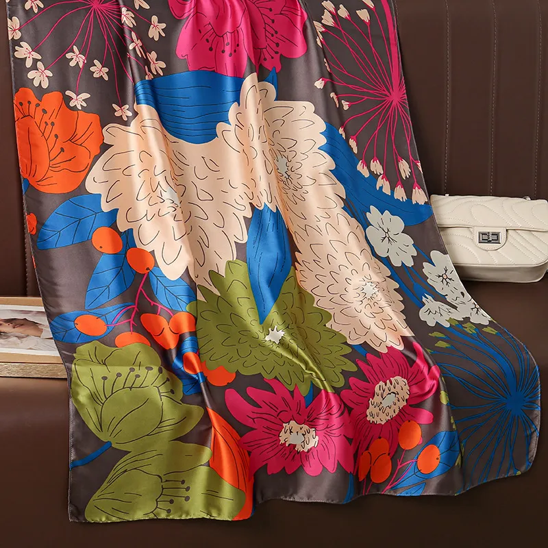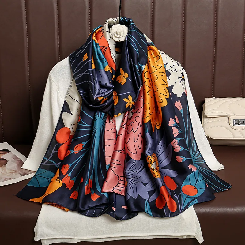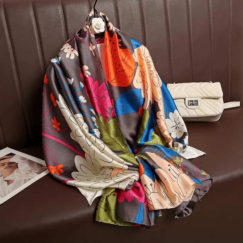 衣都精品- 新款時尚百搭森系植物麗錦緞長款絲巾