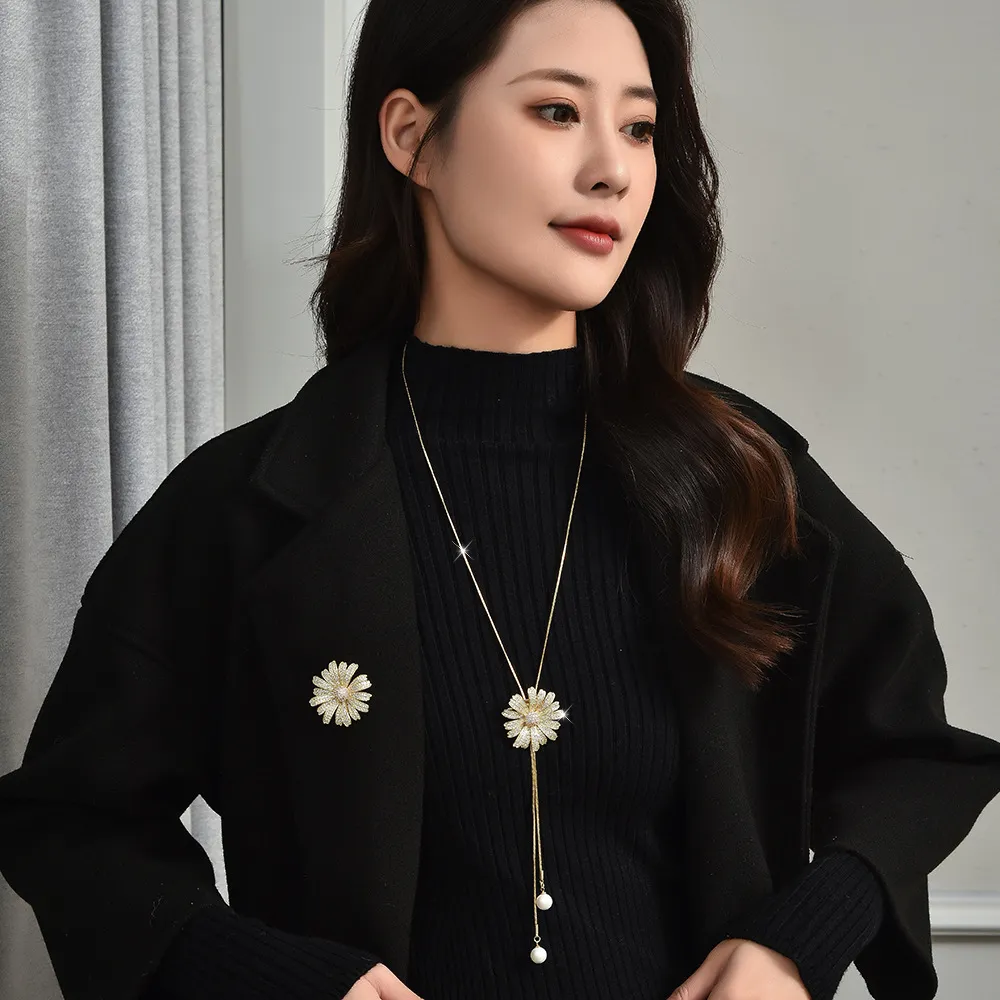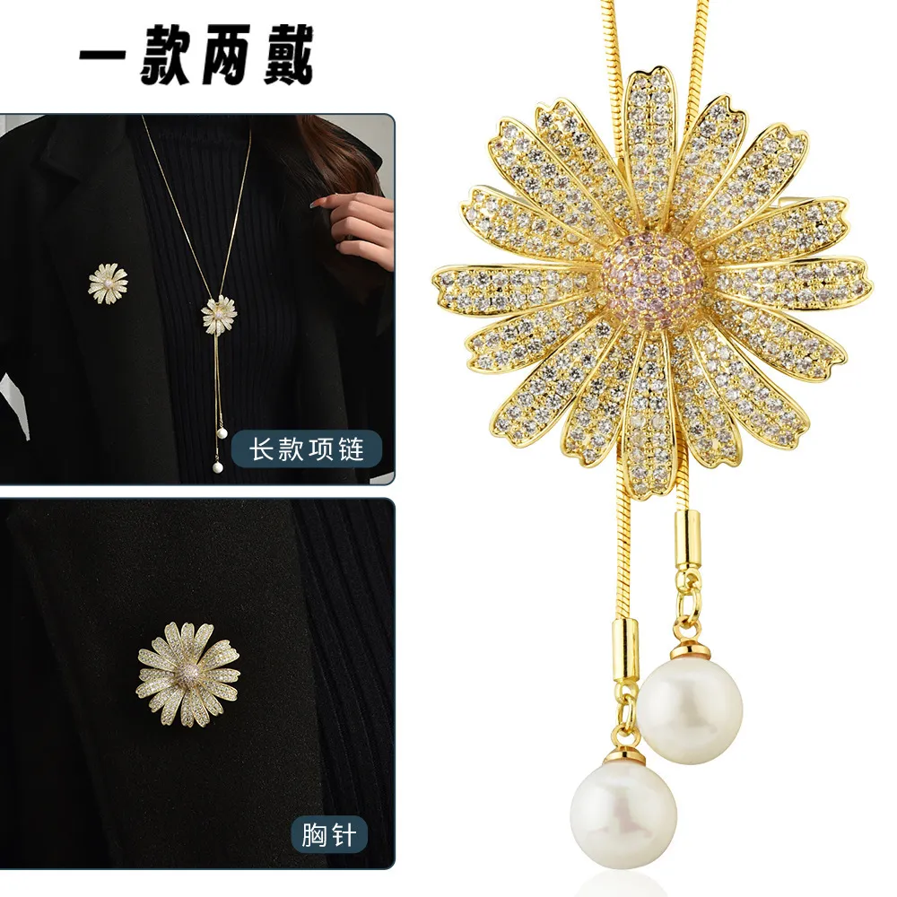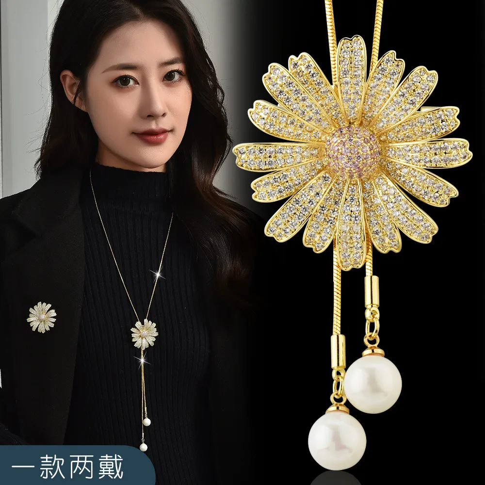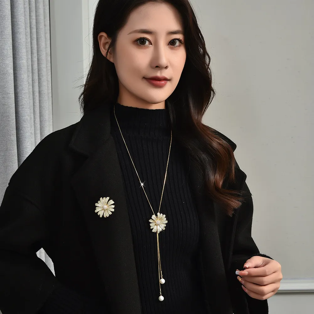 衣都精品- 新款時尚氣質雛菊吊墜長款兩用胸針項鍊