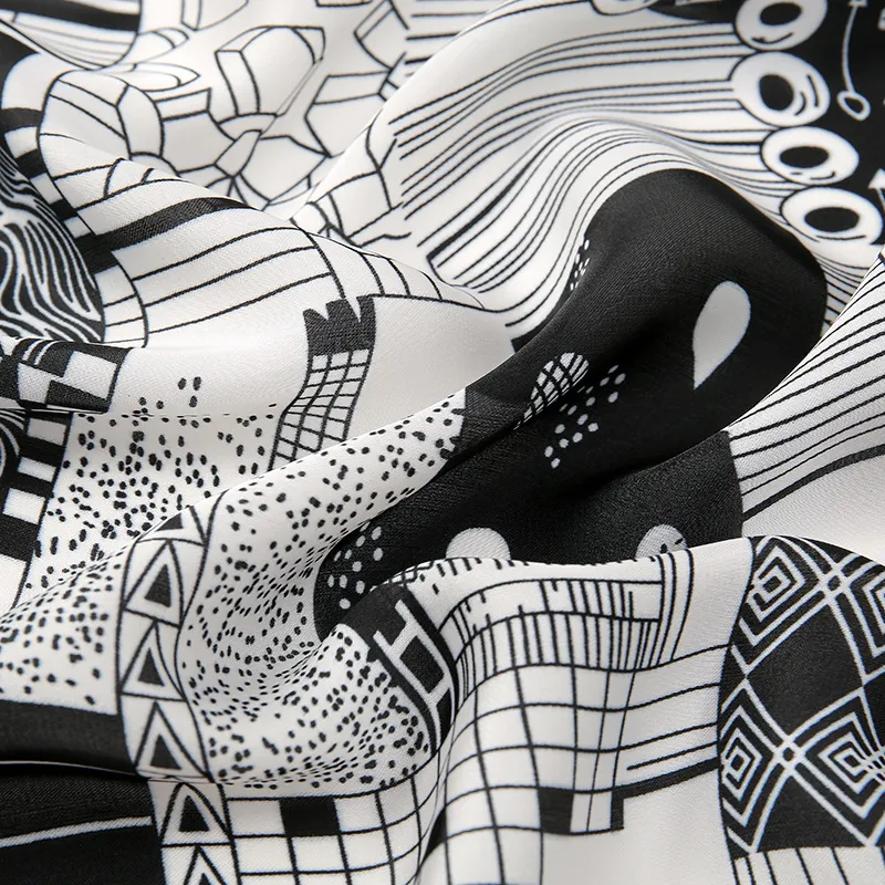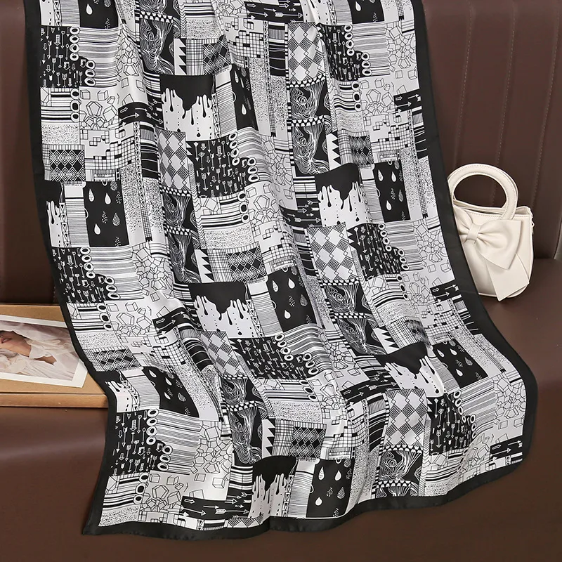 衣都精品- 新款經典黑白幾何拼接麗錦緞長款絲巾