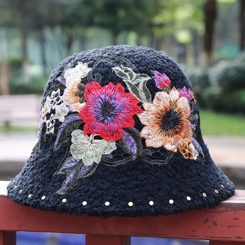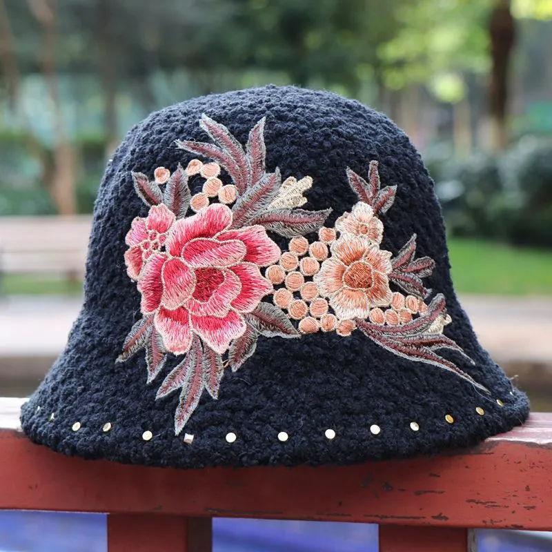 衣都精品- 新款民族風保暖刺繡羊羔絨繡花帽