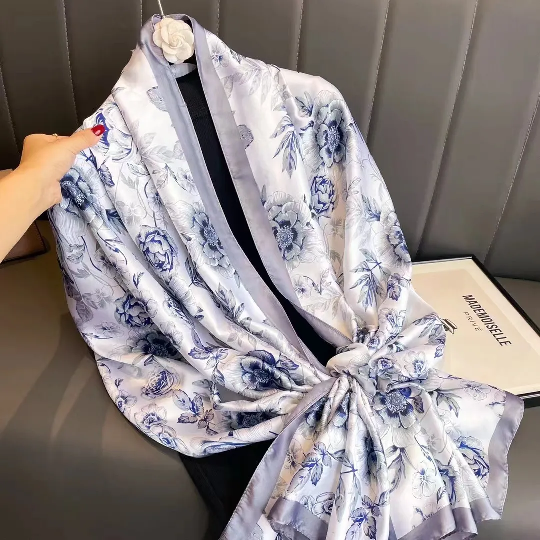 衣都精品- 新款素雅植物玫瑰花花卉麗錦緞長款圍巾