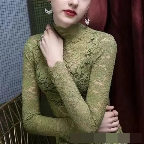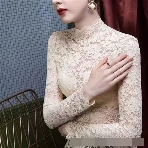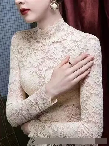 衣都精品- 新款性感網紗鏤空半高領蕾絲打底衫