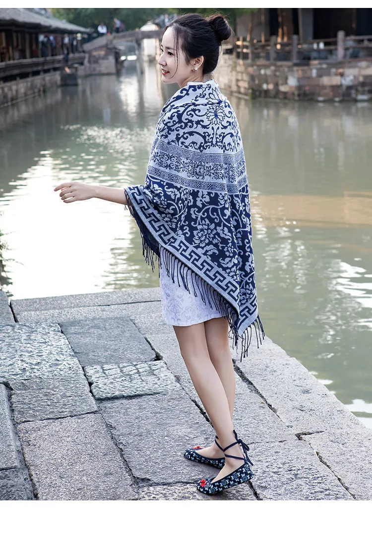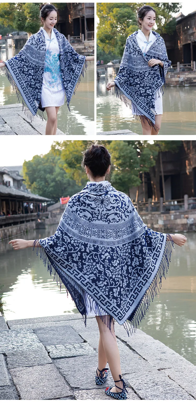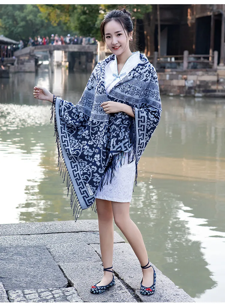 衣都精品- 新款旅遊拍照青花瓷圍巾斗篷披肩