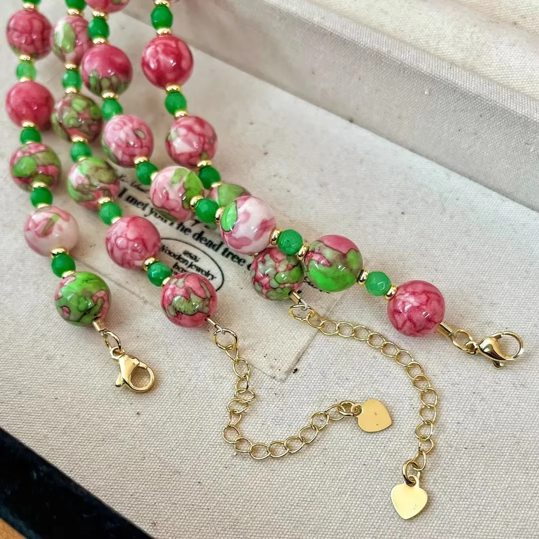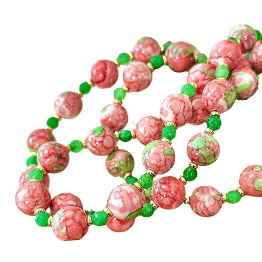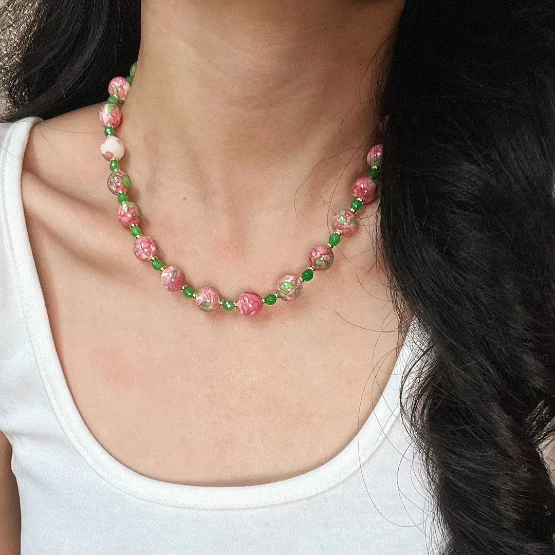衣都精品- 新款復古粉綠琉璃色陶瓷串珠項鍊
