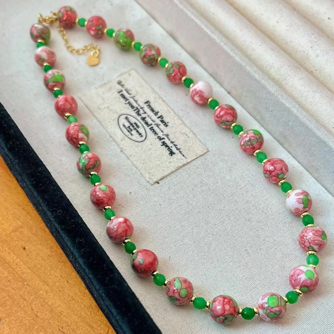 衣都精品- 新款復古蘋果綠混彩天然綠玉髓項鍊