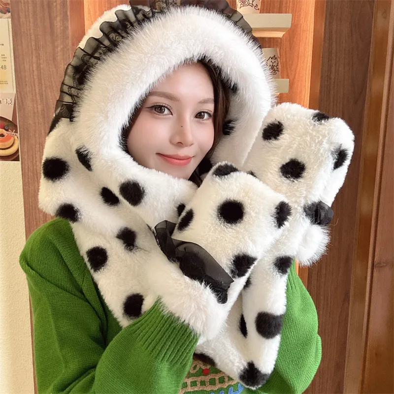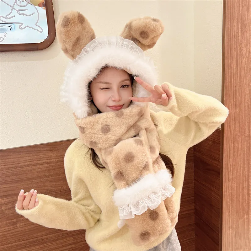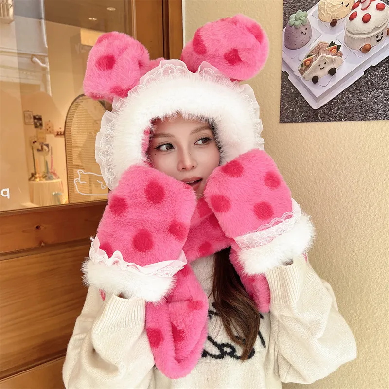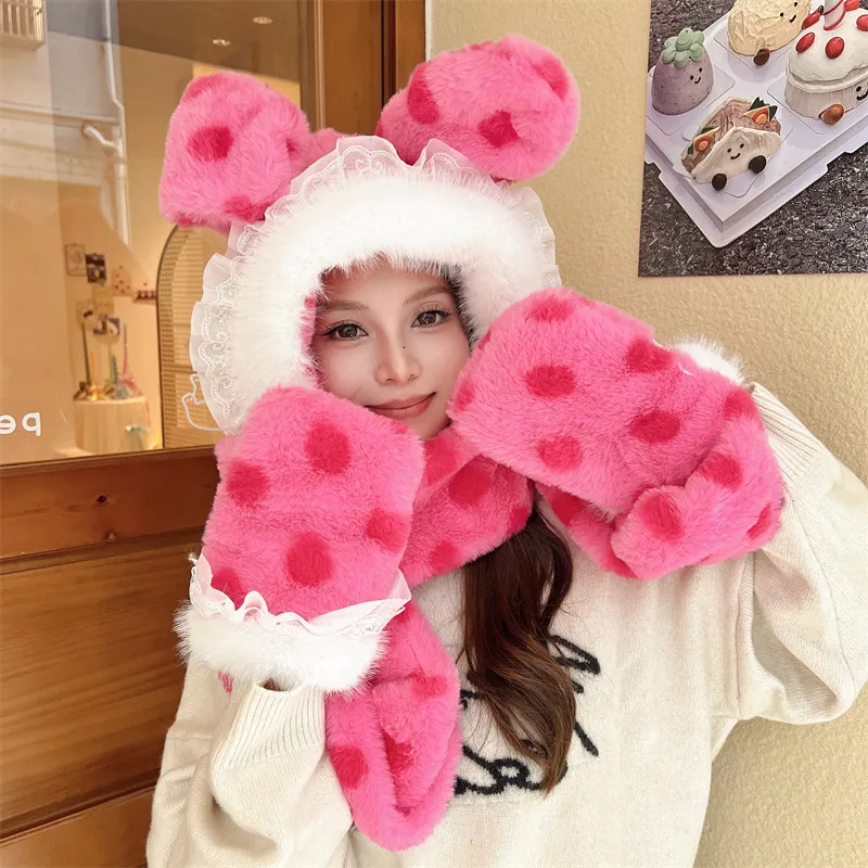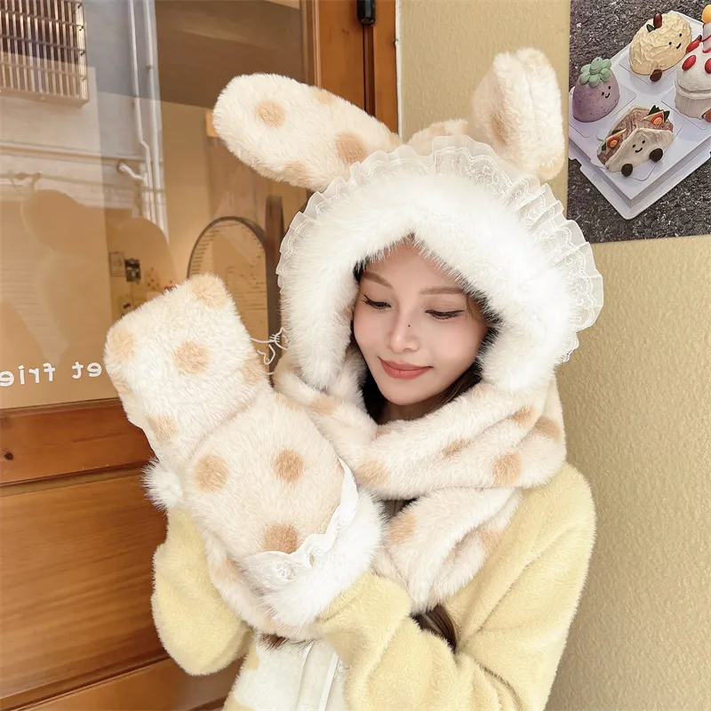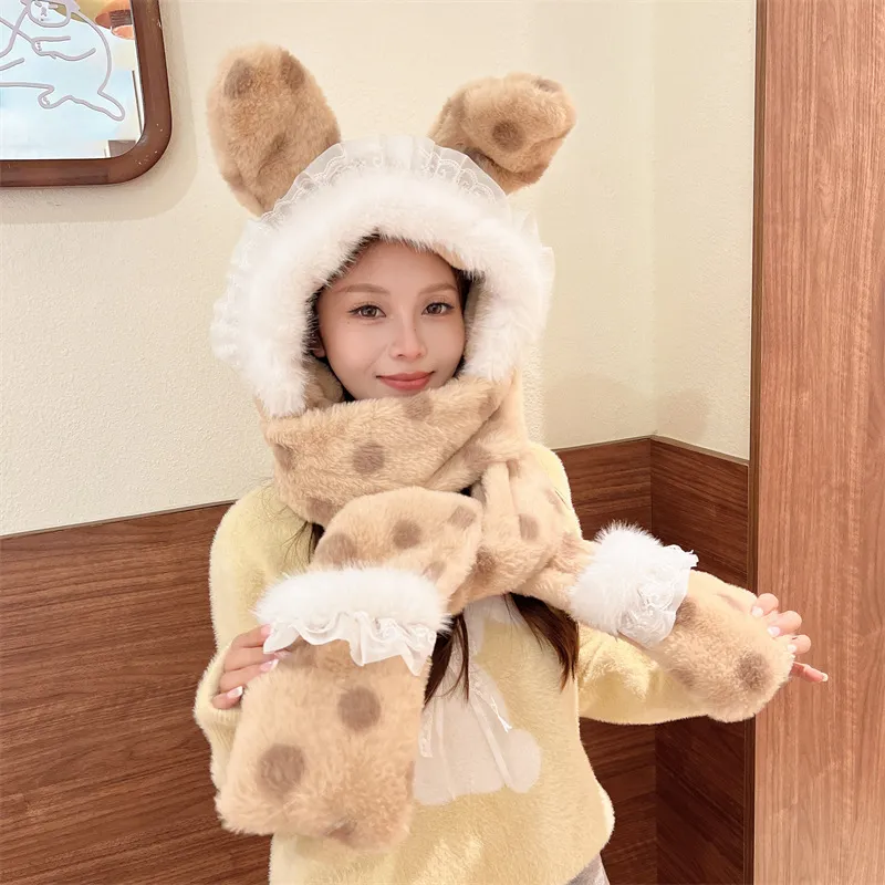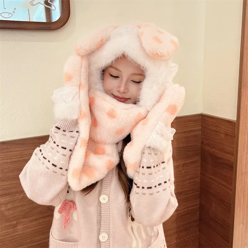 衣都精品- 新款可愛兔耳朵波點帽子圍巾手套保暖三件套